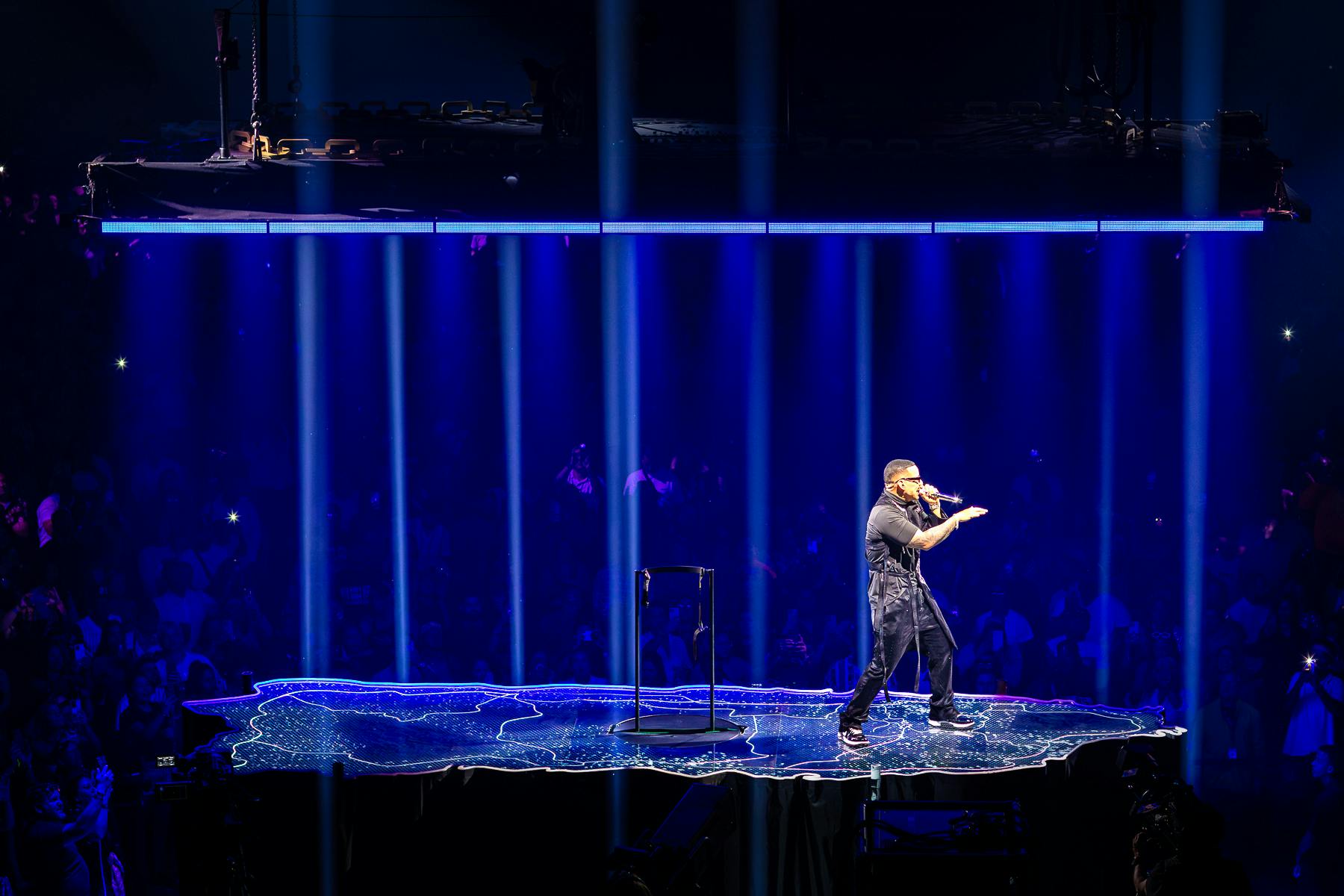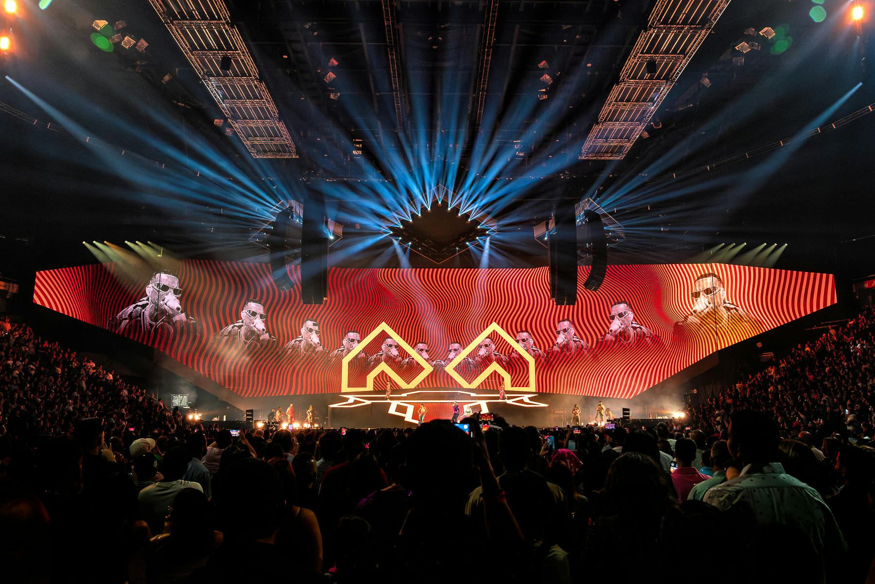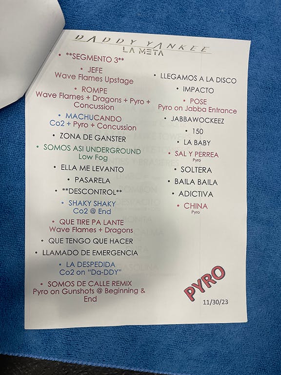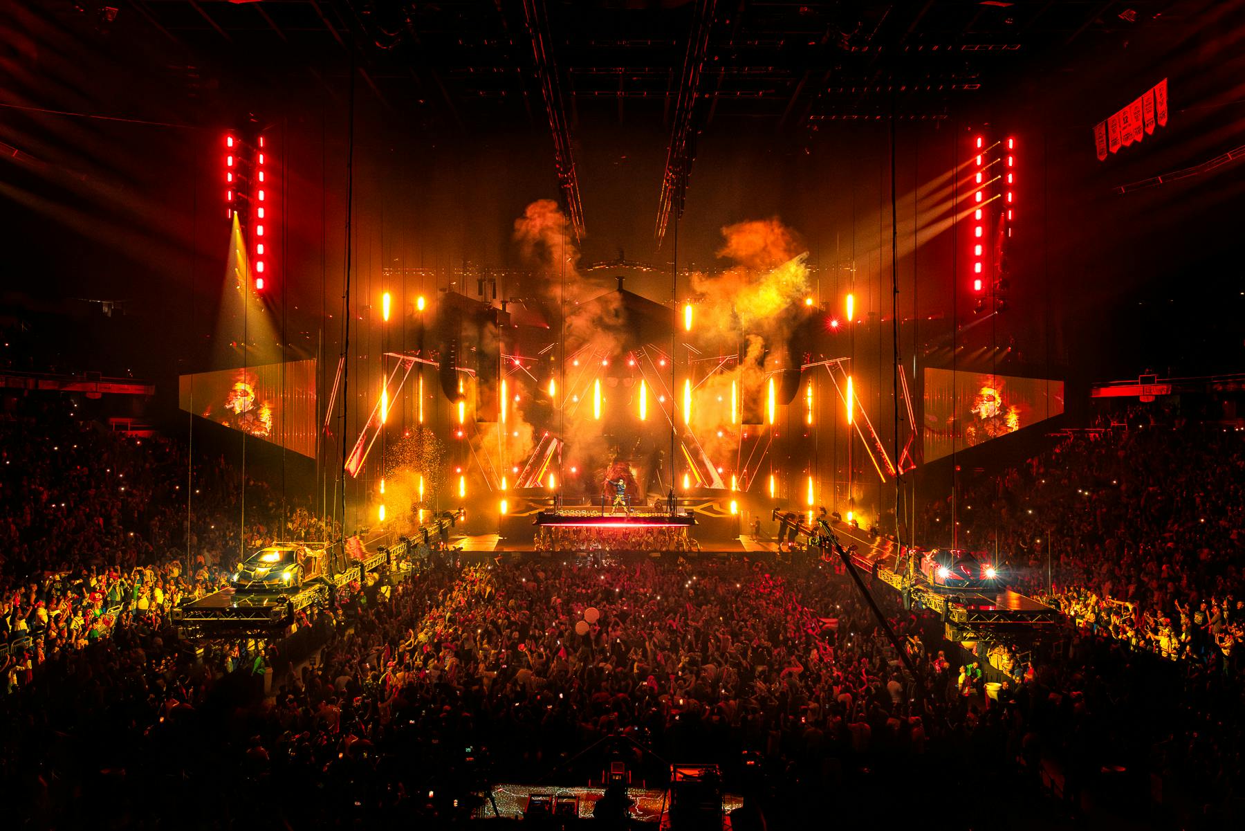DY magically appeared above the audience at the front of the arena via a carefully scripted and engineered intro device. Throughout Act I, he performed the earliest music of his career on a stage resembling the island of Puerto Rico. For Act II, Daddy Yankee traveled back and forth over the audience on a moving pod of lighting, performing the Looney Tunes portion of his career. The top of Act III featured the full cast of 25 dancers and specialty acts performing Jefe. It featured the true spectacle of Daddy Yankee in performance and production elements. The entire arena came to life via a 57' tall, over 200' wide video wall, 60' tall lighting towers, and massive flame units. In the 4th act, the team cemented Yankee's status as the G.O.A.T. with a massive stone bust of DY coming out of the stage. Dancers draped behind and in front him him decked in gold as he sat atop his throne. The show culminated in a live drag race above the audience with race tracks spanning the entire length of the audience.