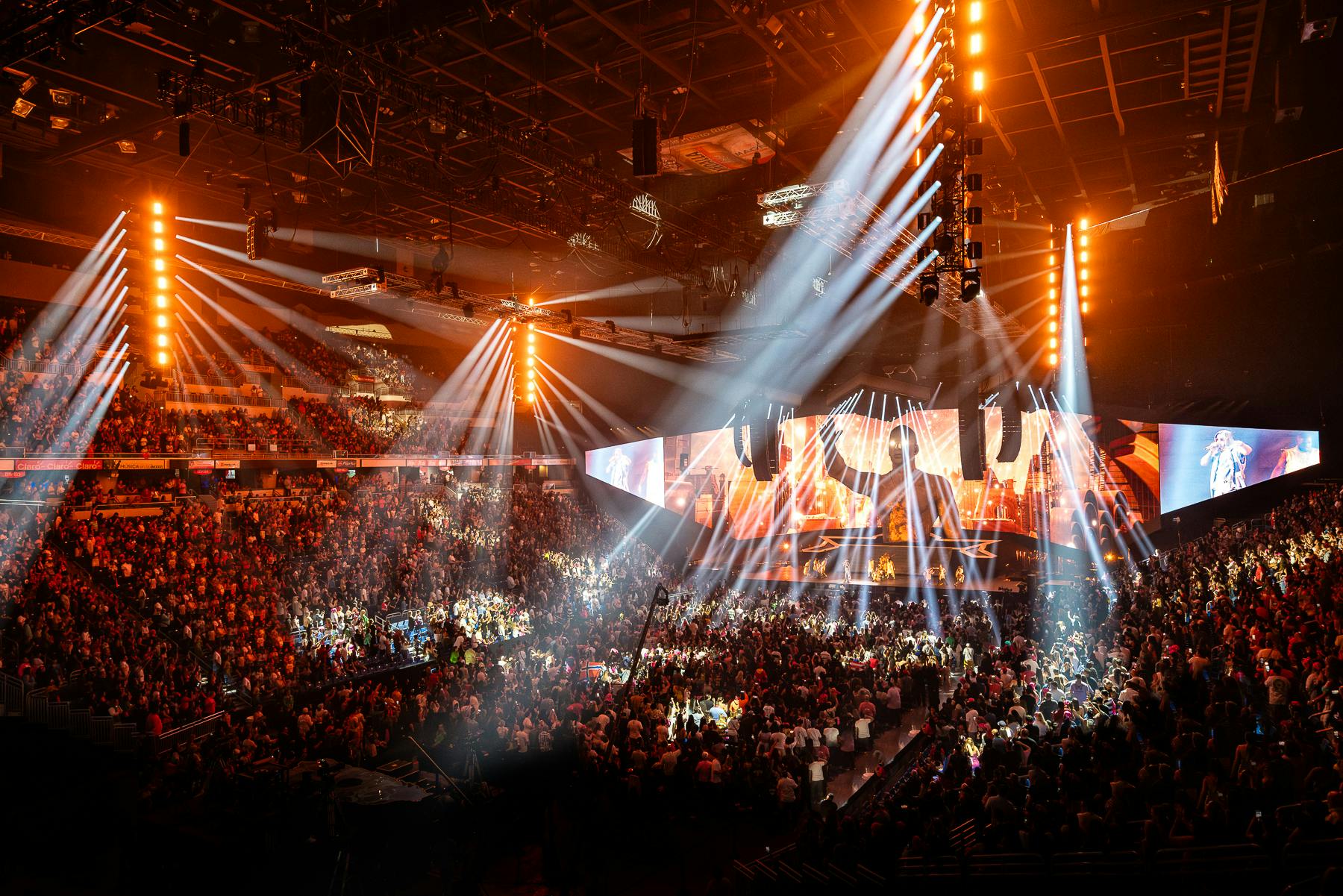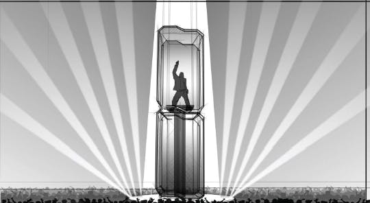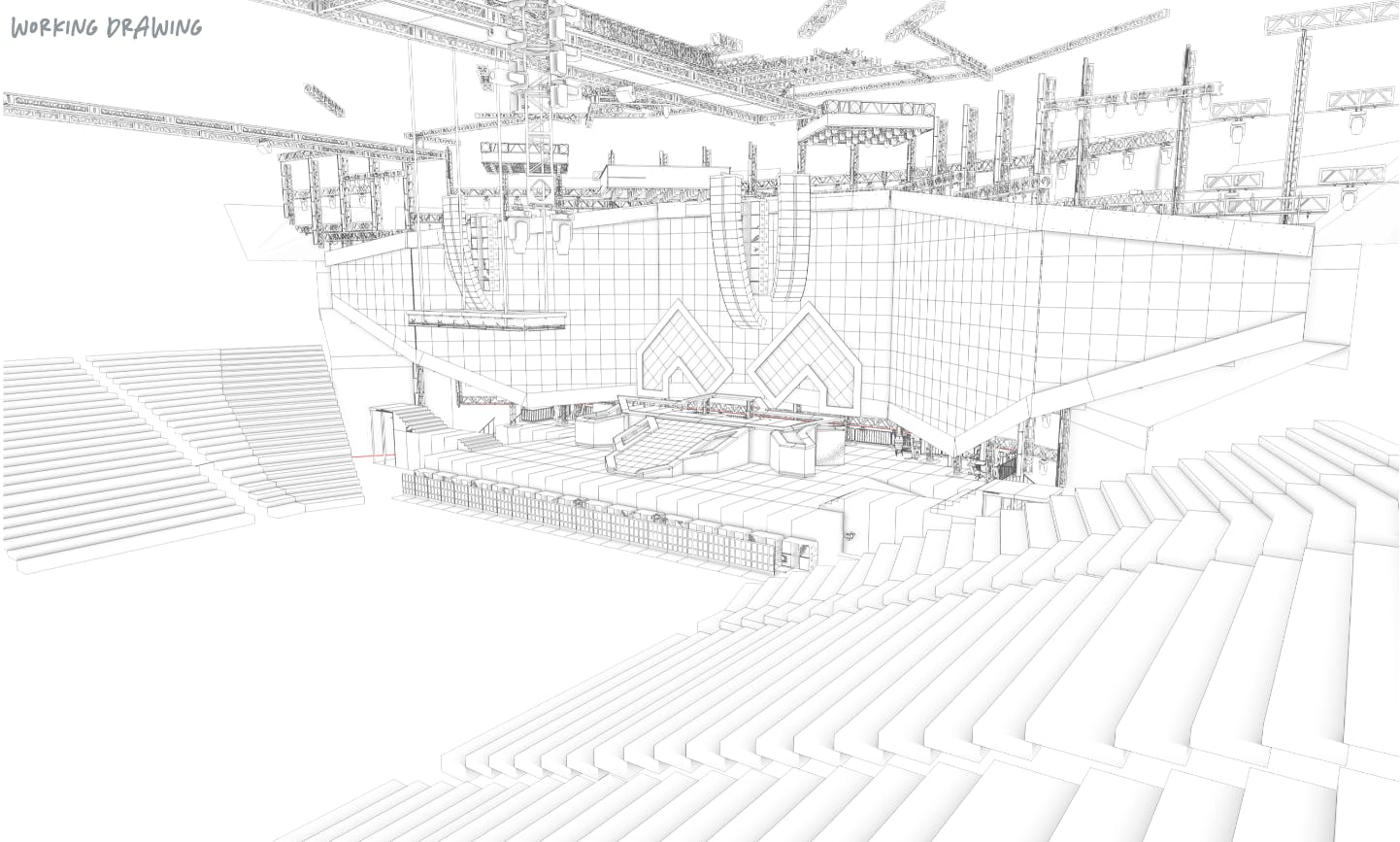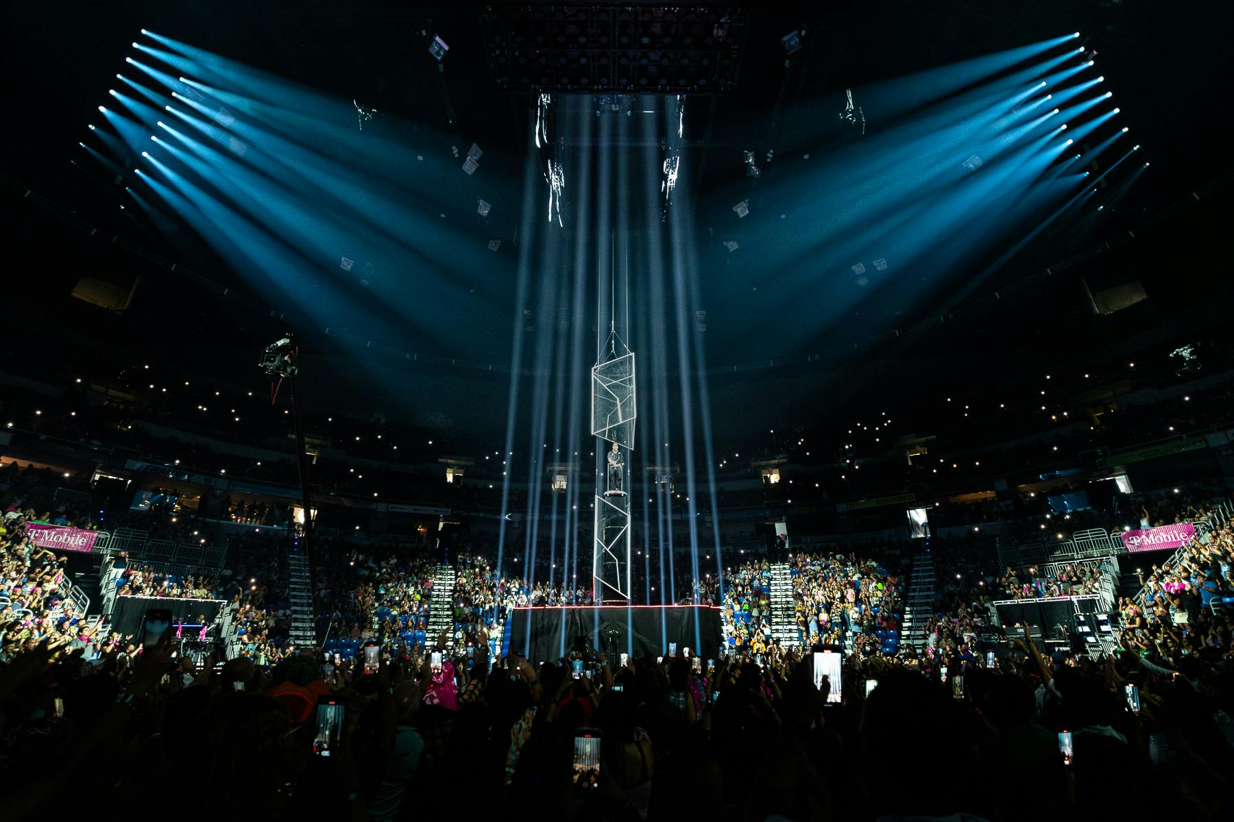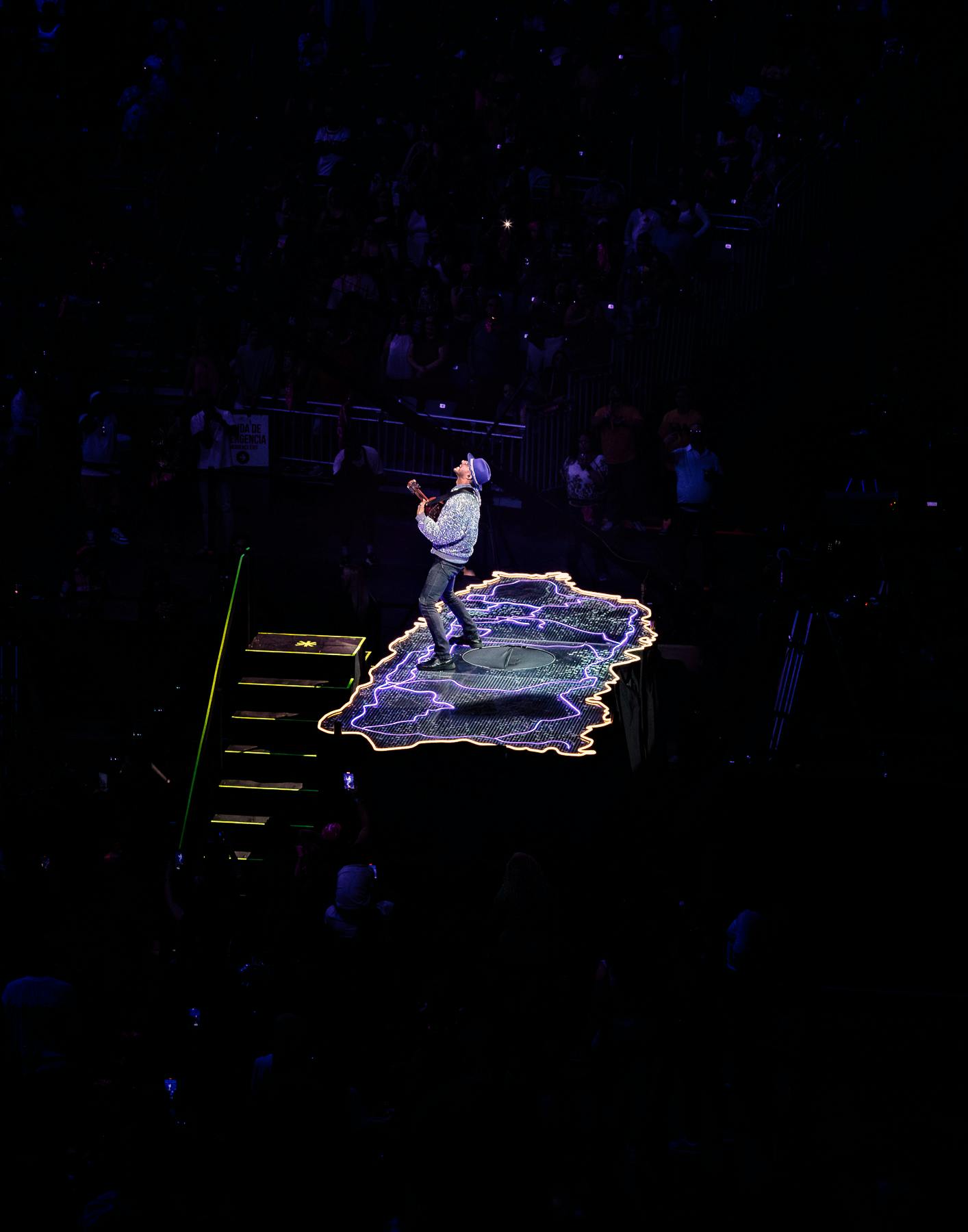 DY magically appeared above the audience at the front of the arena via a carefully scripted and engineered intro device. Throughout Act I, he performed the earliest music of his career on a stage resembling the island of Puerto Rico. For Act II, Daddy Yankee traveled back and forth over the audience on a moving pod of lighting, performing the Looney Tunes portion of his career. The top of Act III featured the full cast of 25 dancers and specialty acts performing Jefe. It featured the true spectacle of Daddy Yankee in performance and production elements. The entire arena came to life via a 57' tall, over 200' wide video wall, 60' tall lighting towers, and massive flame units. In the 4th act, the team cemented Yankee's status as the G.O.A.T. with a massive stone bust of DY coming out of the stage. Dancers draped behind and in front him him decked in gold as he sat atop his throne. The show culminated in a live drag race above the audience with race tracks spanning the entire length of the audience.