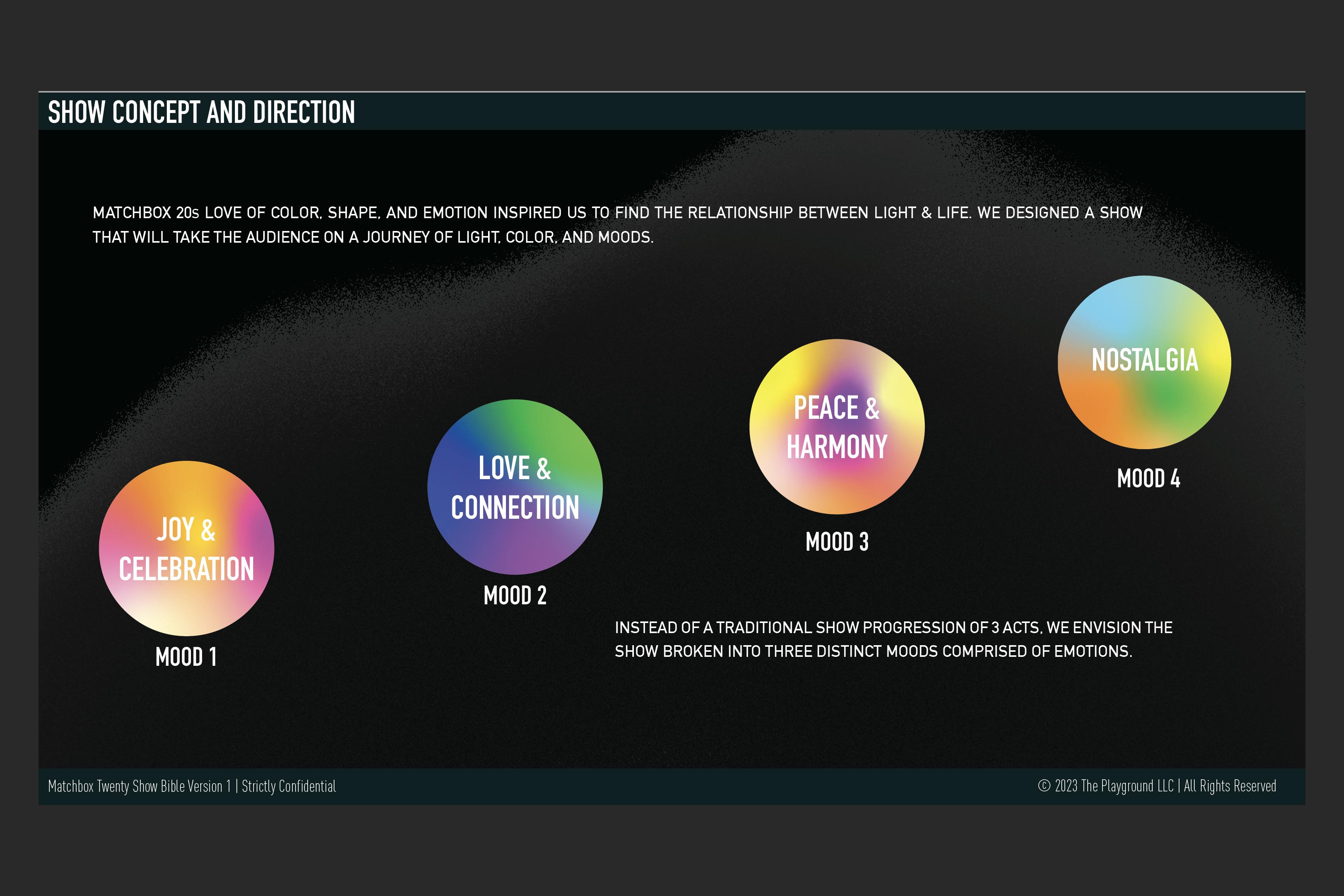The moods composed of feelings and emotions that were married to colors used to drive lighting and content.
