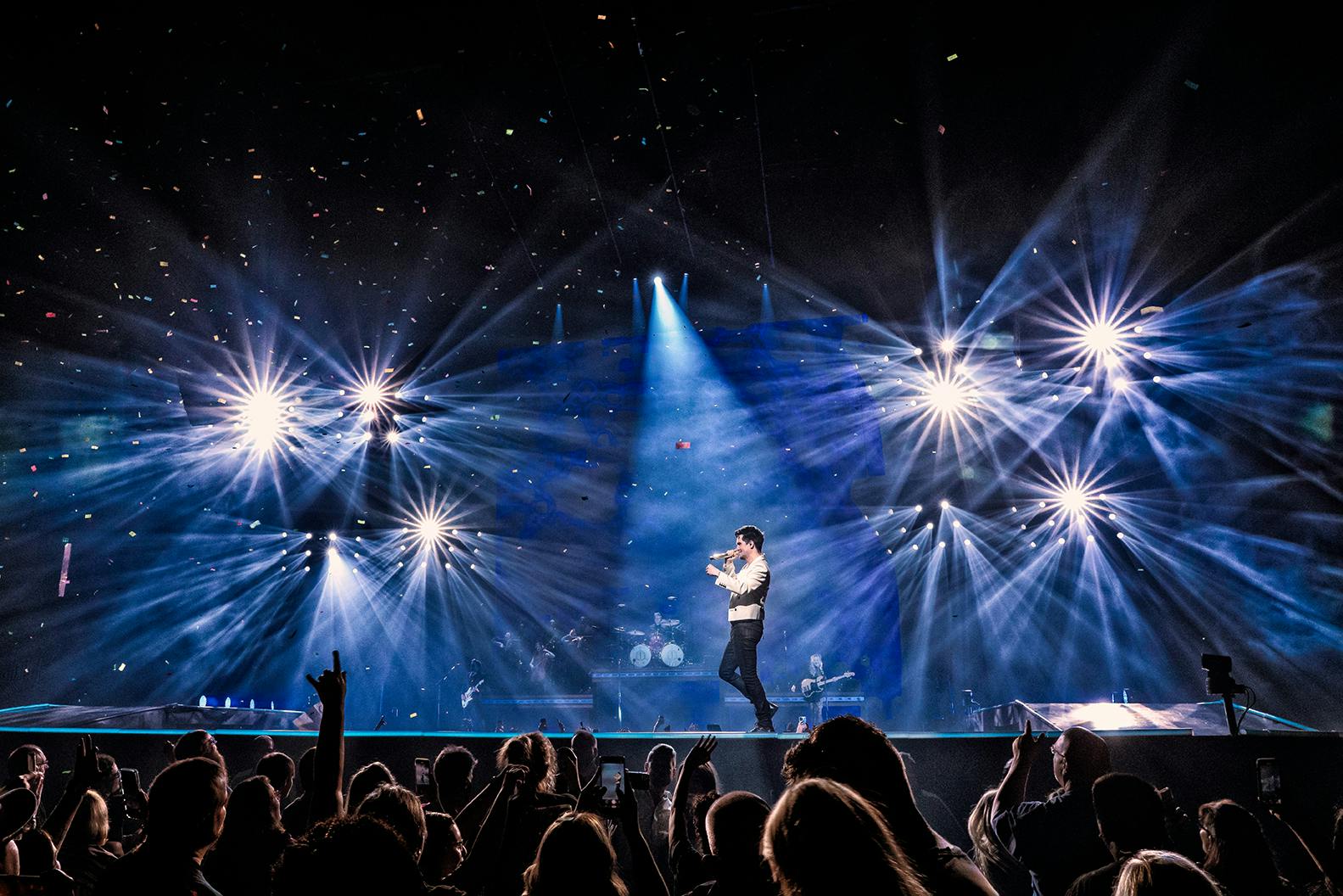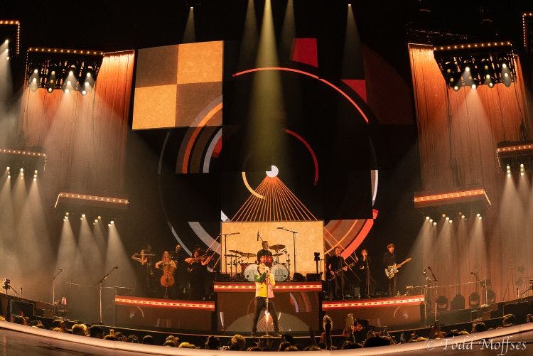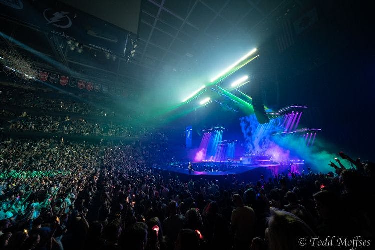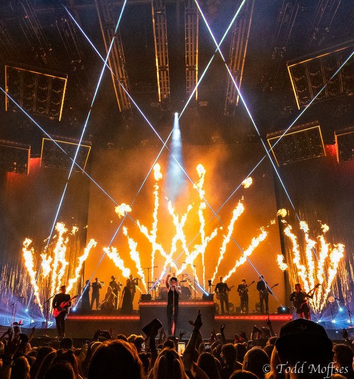 All lighting, pyro, video content and production scripting adhered to specific colors and film effects to maintain the 70’s, vintage feel. Act Three, aptly named “The Hits Keep Coming,” continued to bash the audience into submission with more hits starting with a rainbow waterfall for “Girls, Girls, Boys.” The production continued its pyrotechnics, automation, and laser display through the rest of the evening, culminating in the finale song “High Hopes.”