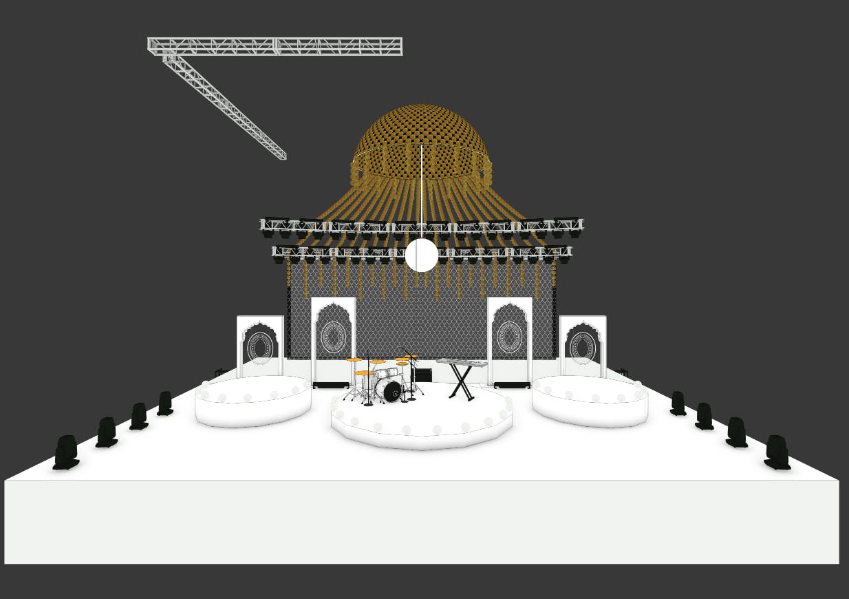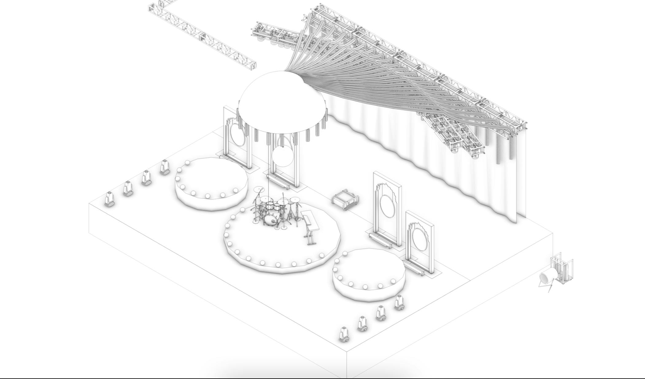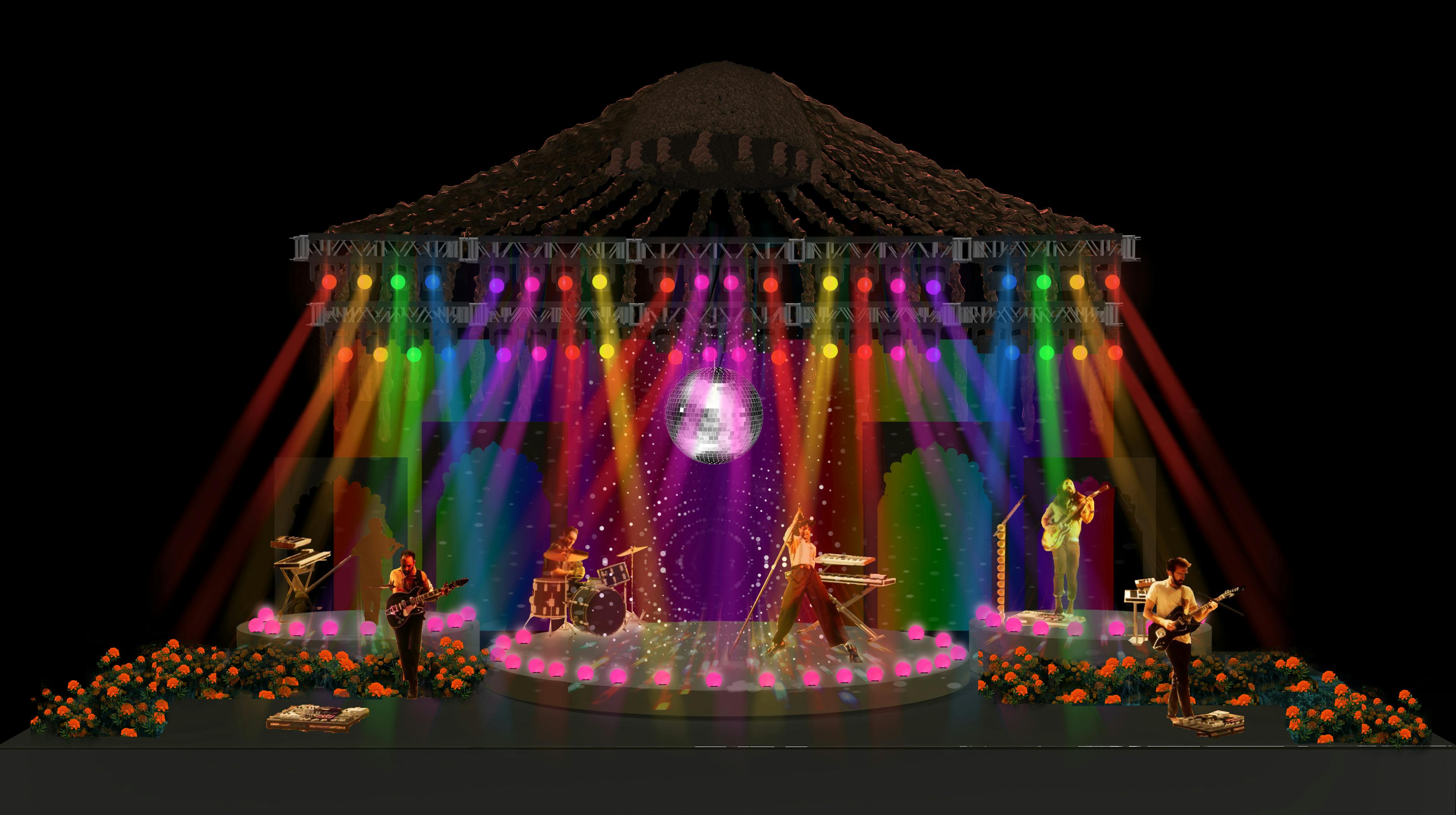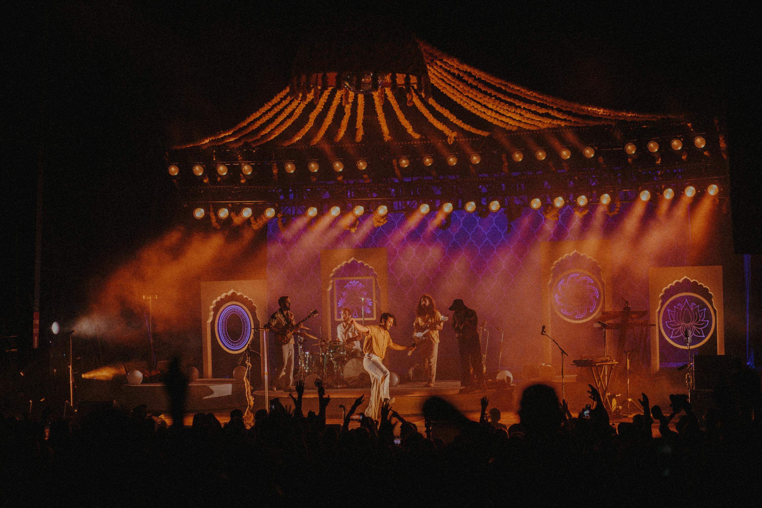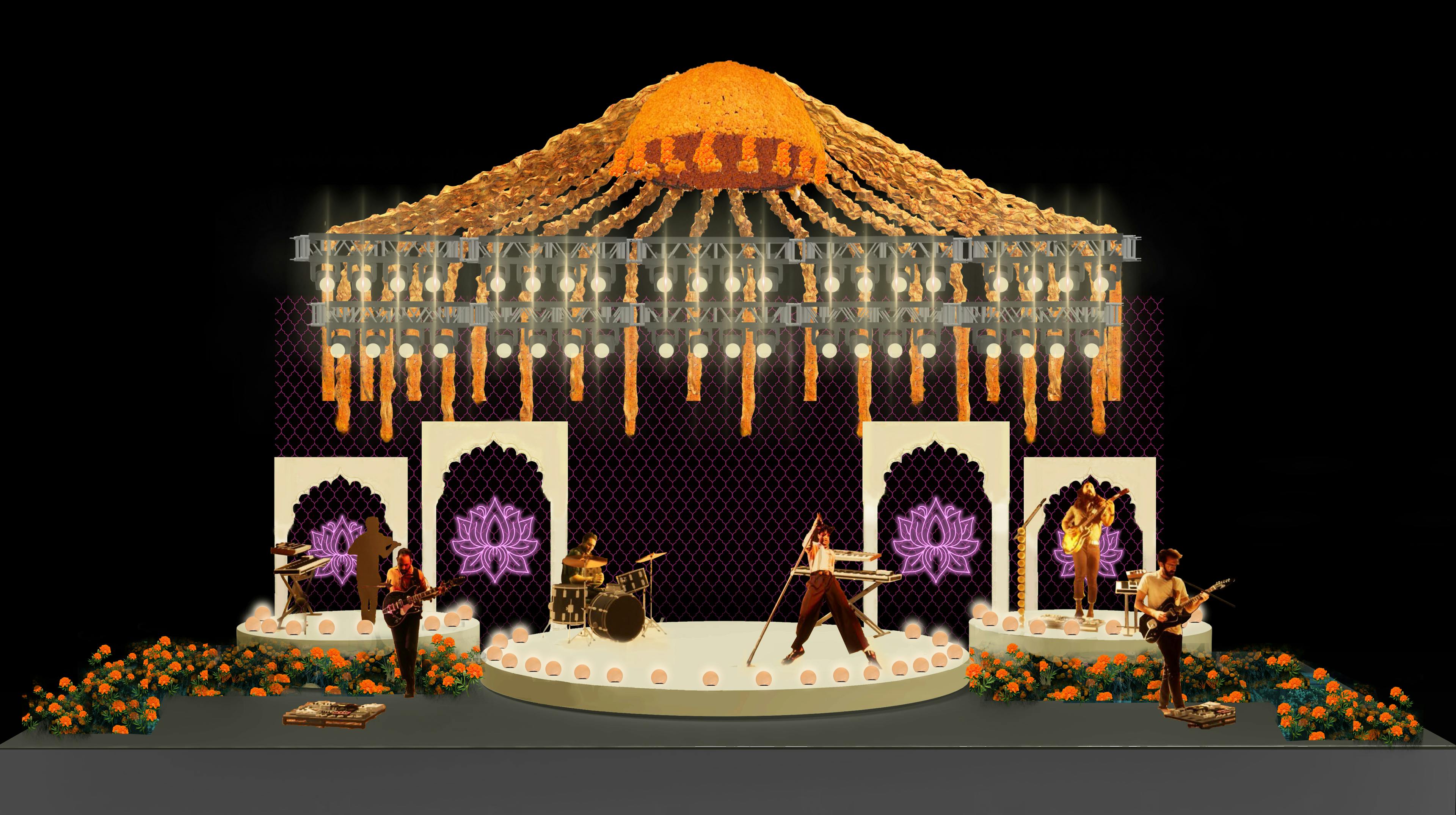 The Playground worked with Mikey Lavi to portray the themes of American Bollywood by integrating the four acts from the album into the show. Each symbol was represented by edge lit plexiglass signs that changed throughout the night. The band created interstitial videos to play at the top of each act on a projection screen that was revealed behind a lattice printed scrim curtain. The Playground designed a marigold canopy and chandelier in place of an overhead lighting rig to help carry the Bollywood themes across the stage.