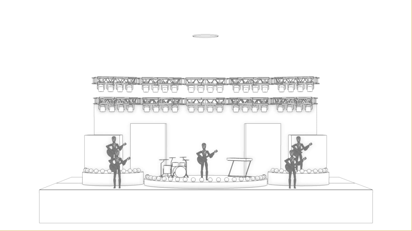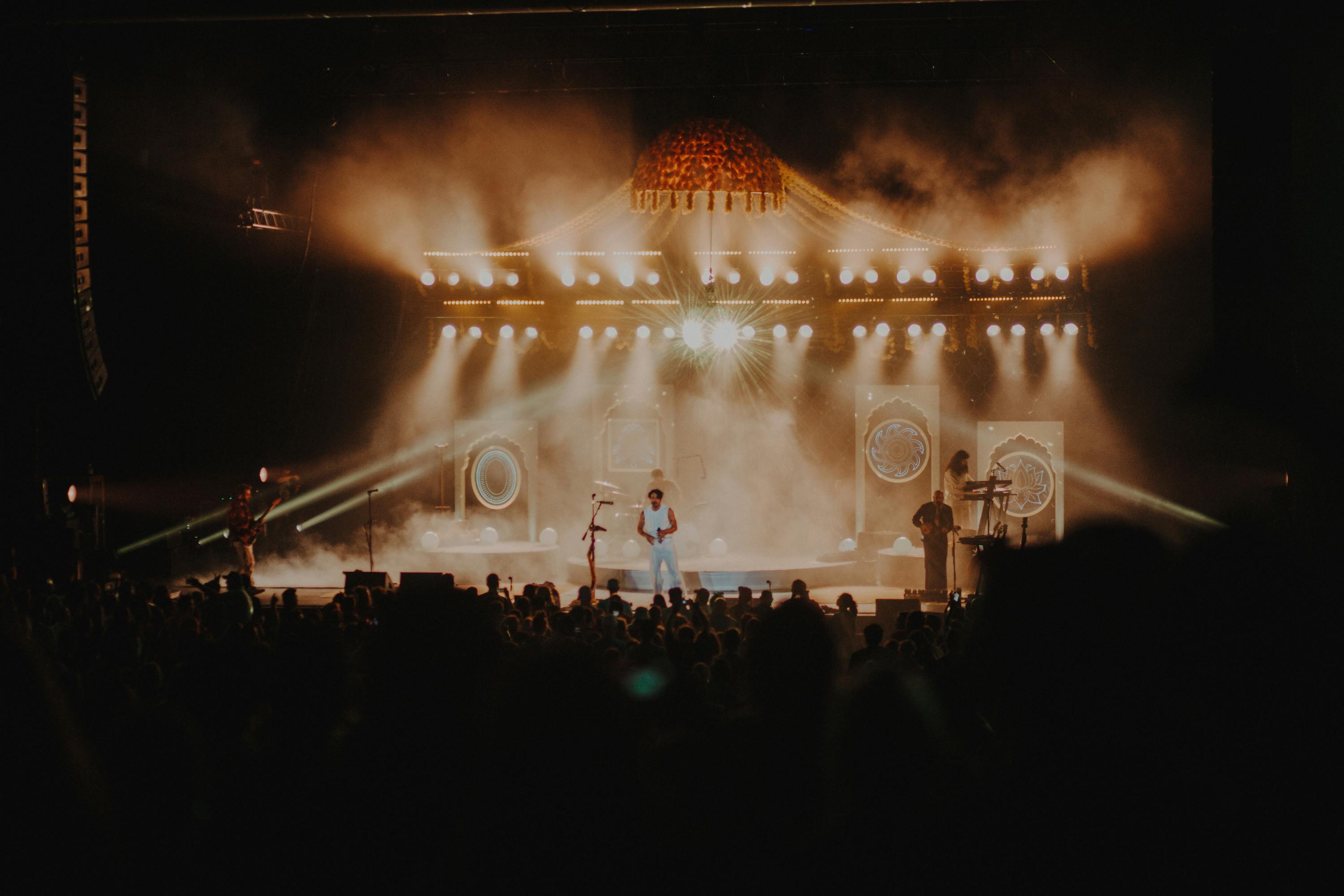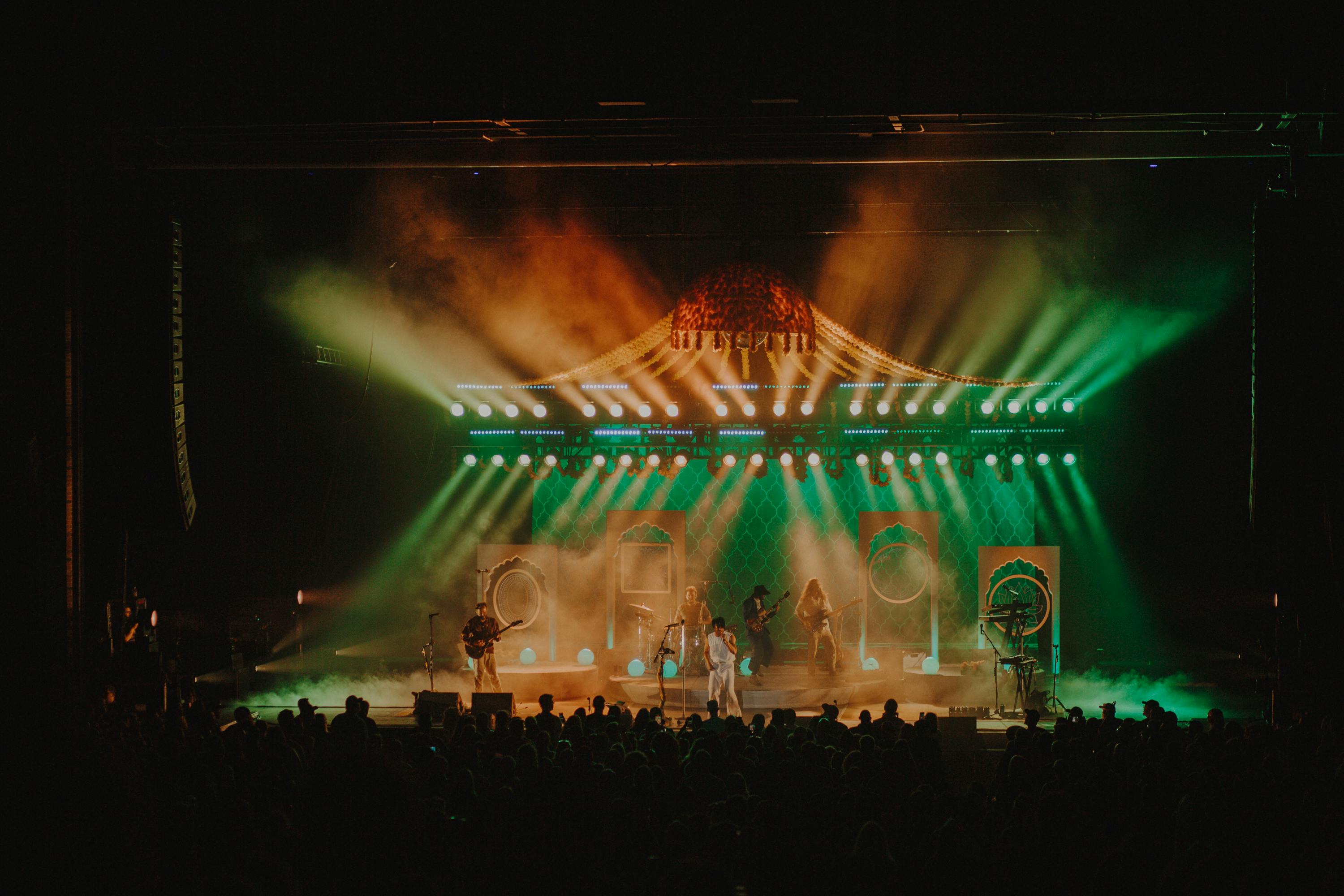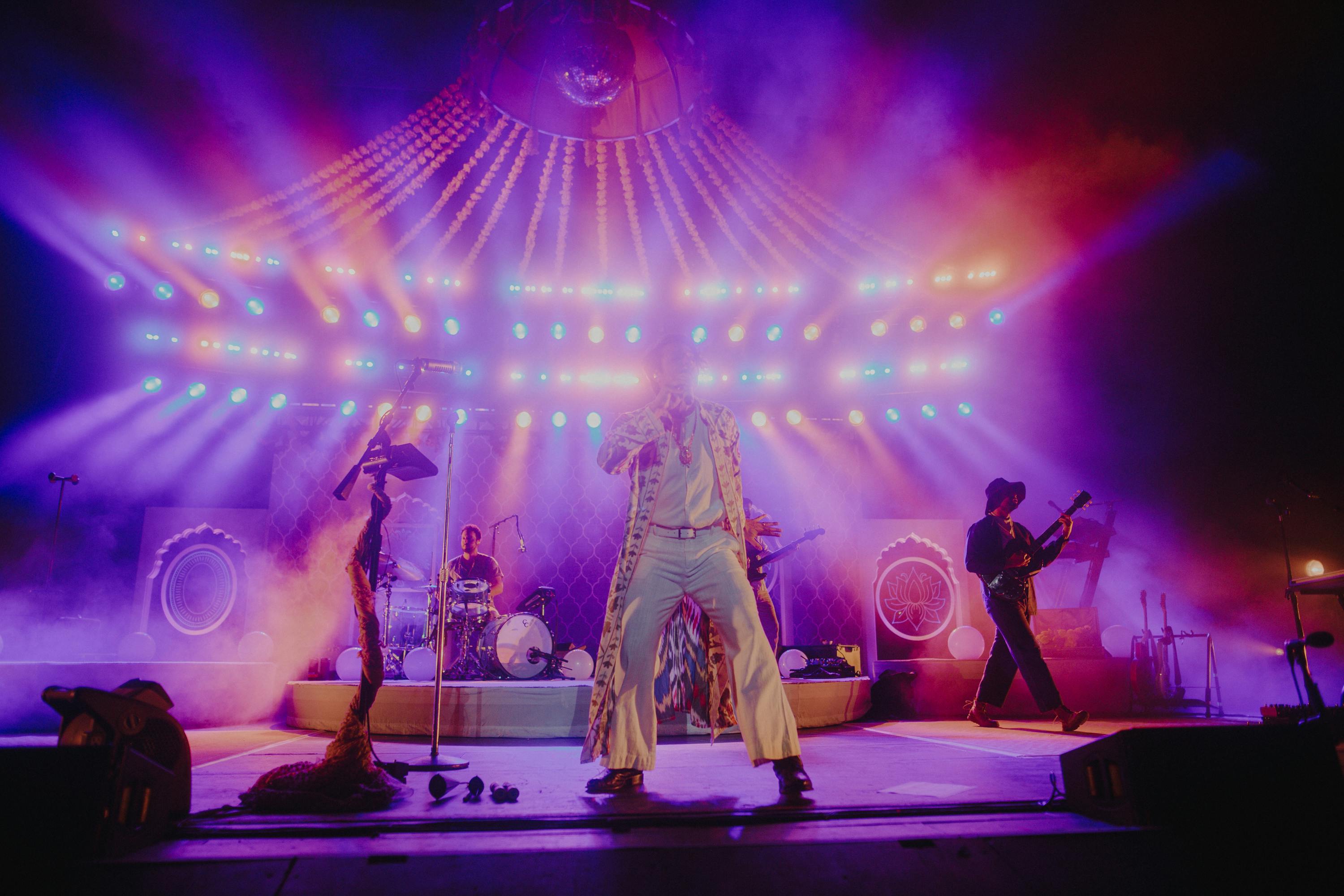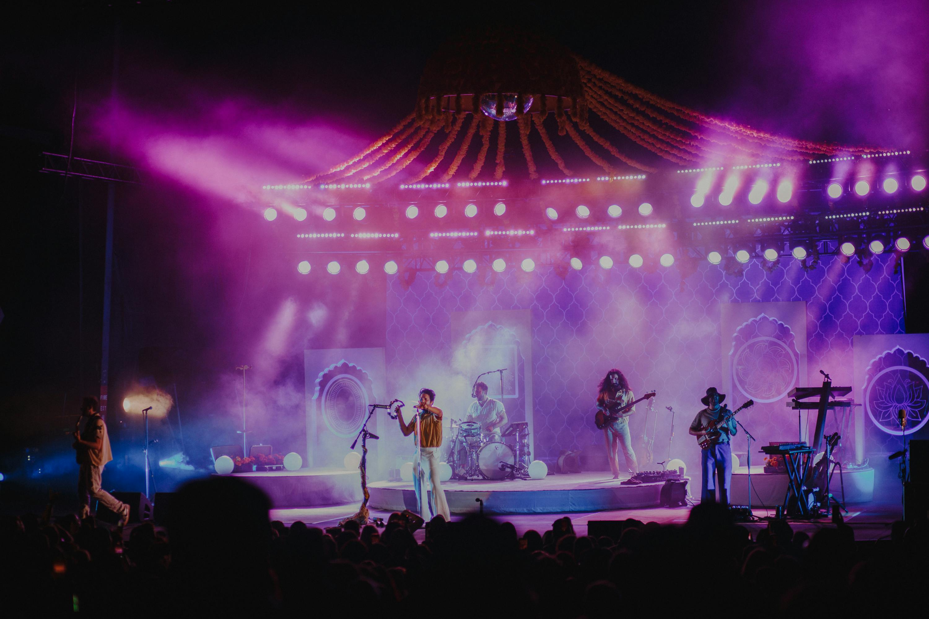 The Playground worked with Mikey Lavi to portray the themes of American Bollywood by integrating the four acts from the album into the show. Each symbol was represented by edge lit plexiglass signs that changed throughout the night. The band created interstitial videos to play at the top of each act on a projection screen that was revealed behind a lattice printed scrim curtain. The Playground designed a marigold canopy and chandelier in place of an overhead lighting rig to help carry the Bollywood themes across the stage.