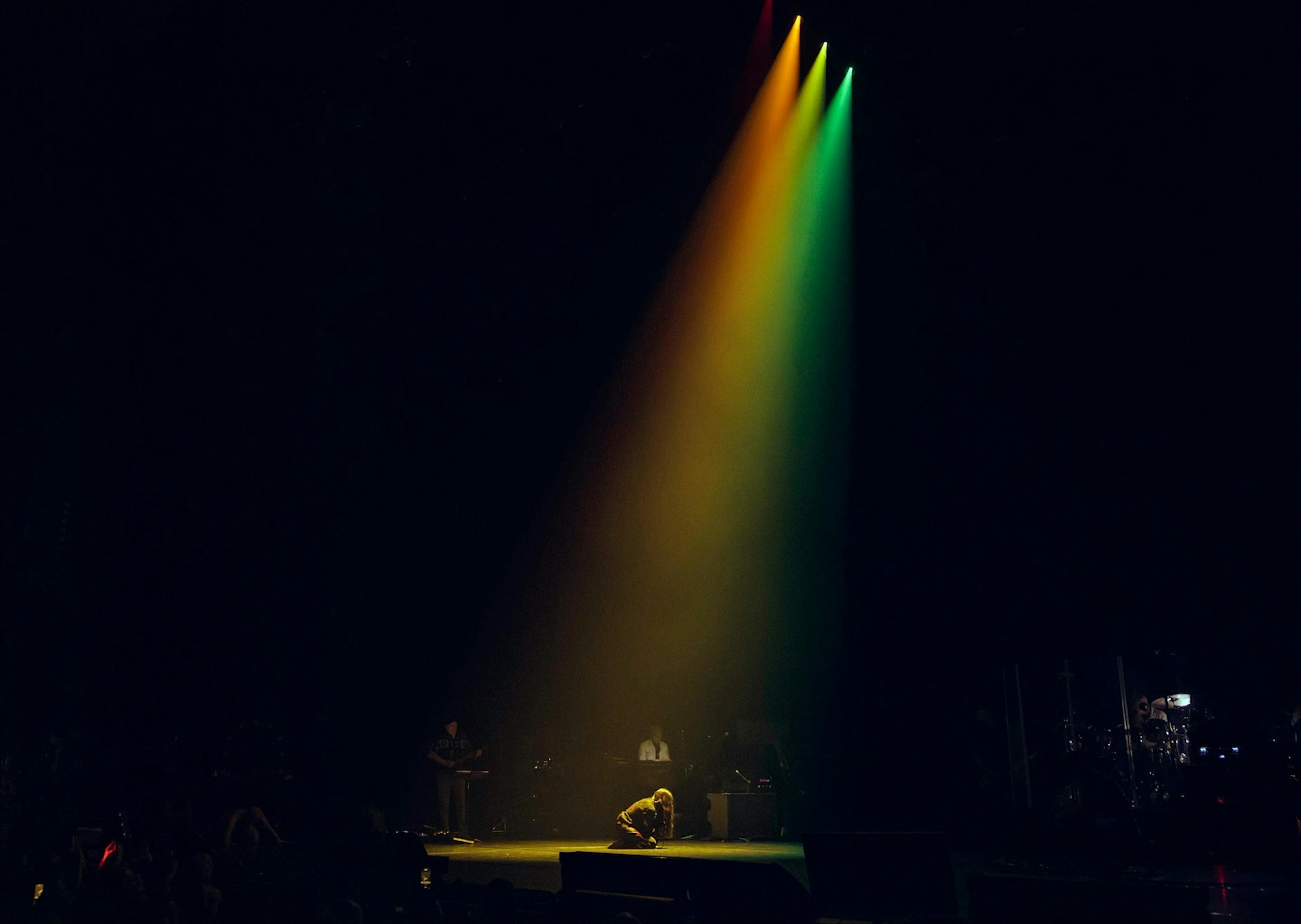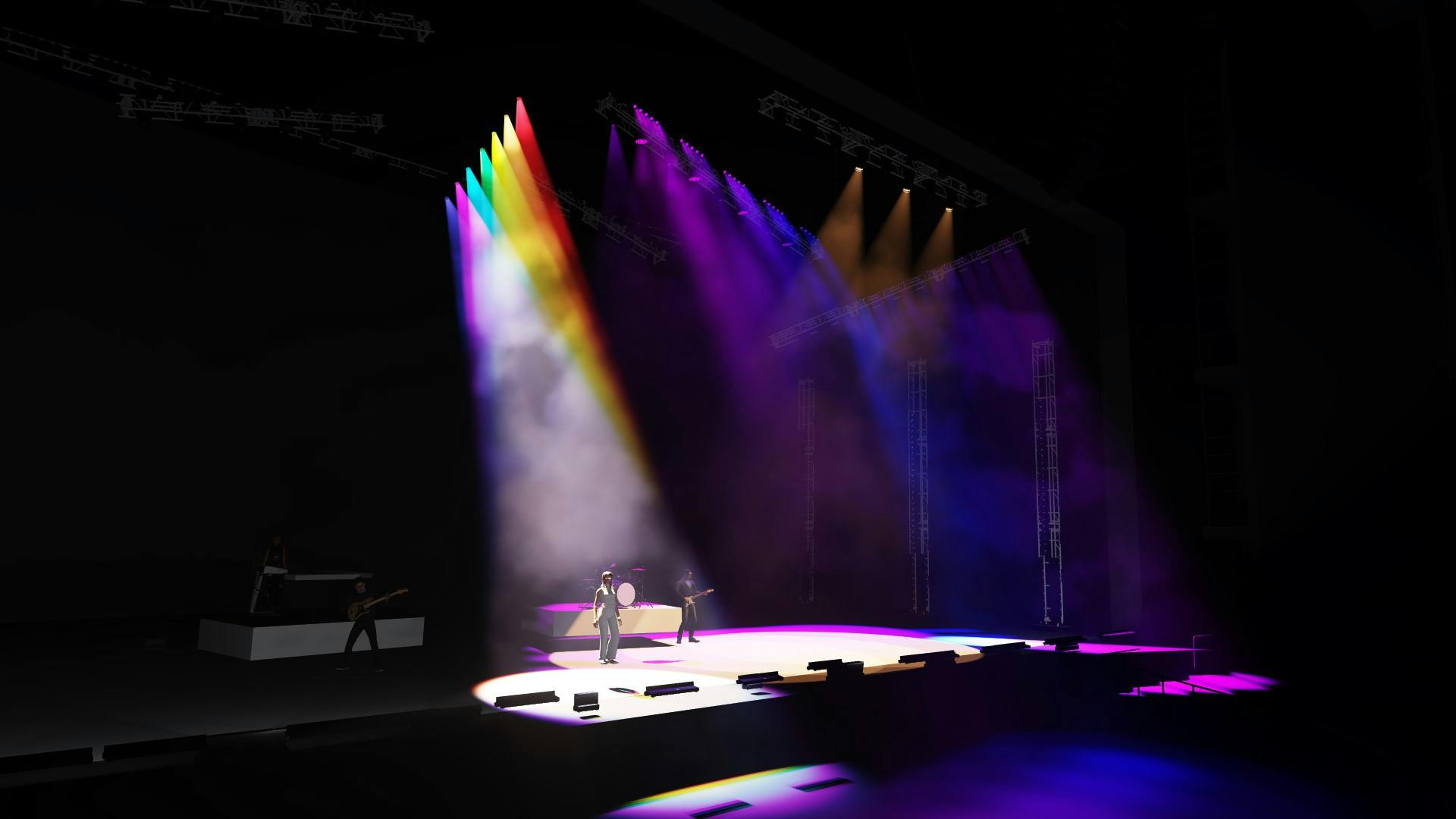 For each song, the backlight color became the core of the visual narrative, directly tied to its corresponding chakra and emotional tone. At the conclusion of each act—during a sequence titled Reckoning 1, 2, and 3—all seven chakra colors align and additively mix into white from behind the performers. This moment creates a powerful visual resolution, where color, intention, and storytelling converge into a single, unified image.
