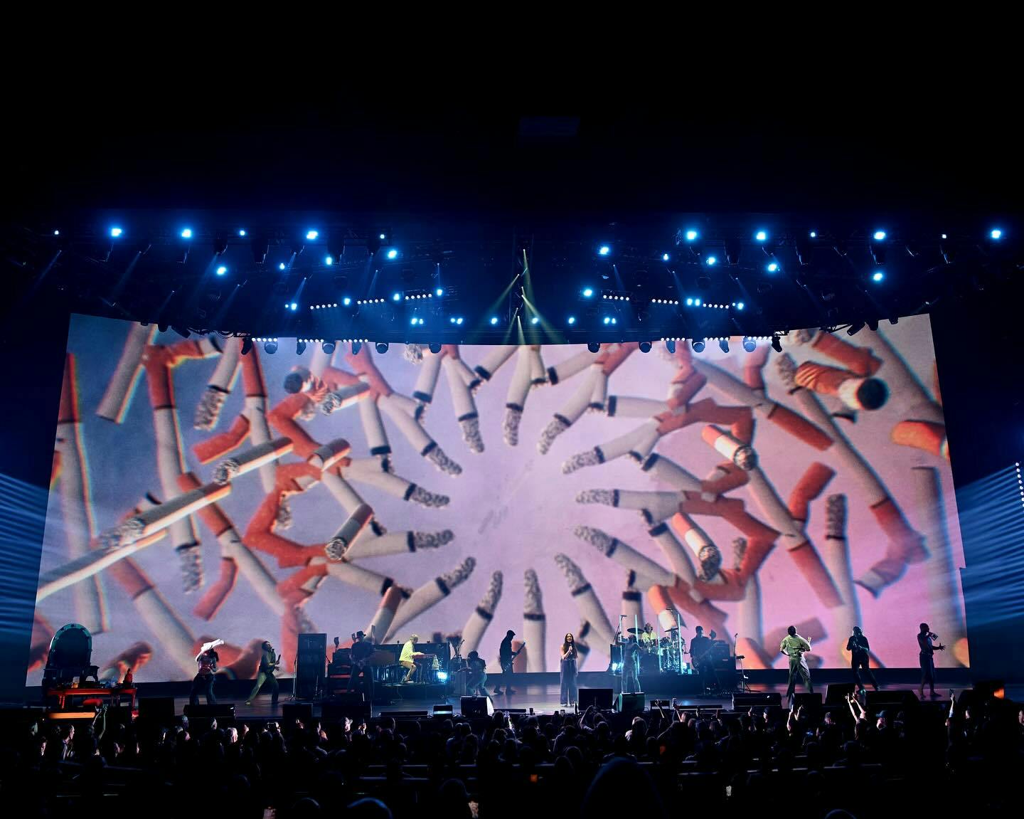 The lighting design is anchored by a center spine truss featuring seven backlight fixtures dedicated to Alanis and the band, serving as a constant visual presence throughout the show. A performer-tracking system was specified and deployed, effectively turning every fixture into a follow spot. This allowed the lighting programming to respond dynamically to choreography and blocking changes in real time.