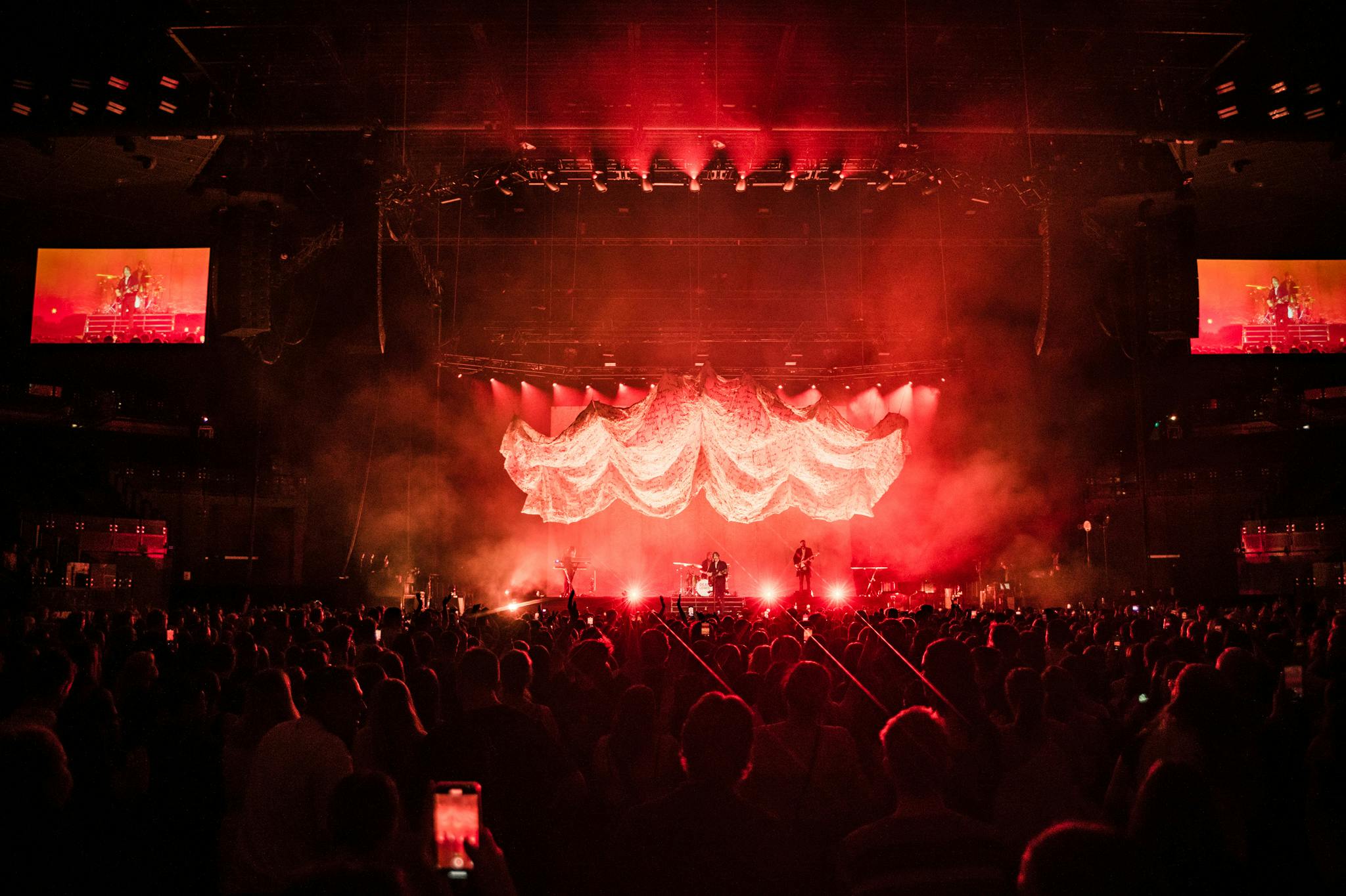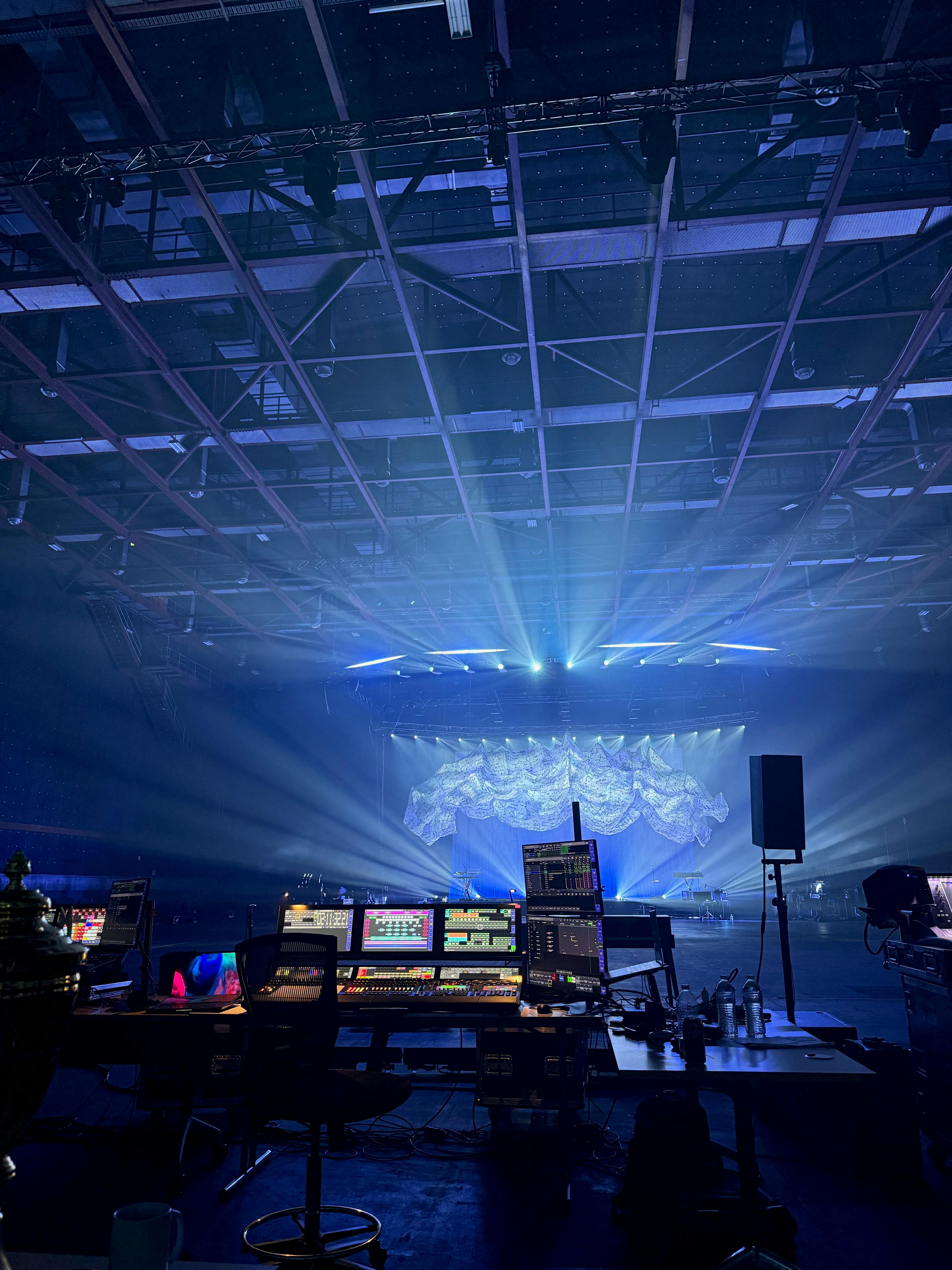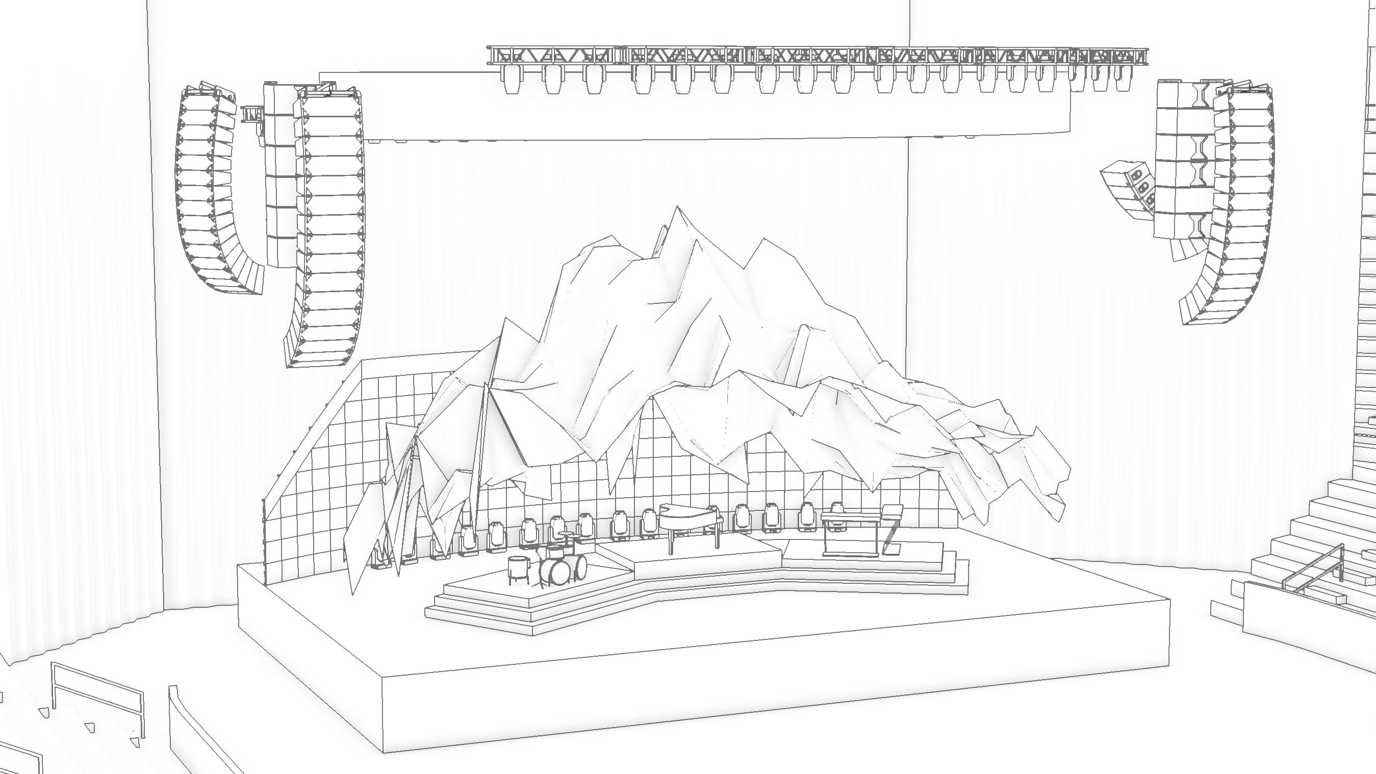 Positioned above the stage, the paper mountain served both as a visual focal point and a thematic anchor, reinforcing the introspective nature of the Epilogue album. The lighting design, led by Ian Haslauer and directed by Bowen Moss, enhanced this effect by casting dynamic shadows and soft glows onto the sculpture, creating an atmosphere that mirrored the emotional depth of the performances.
