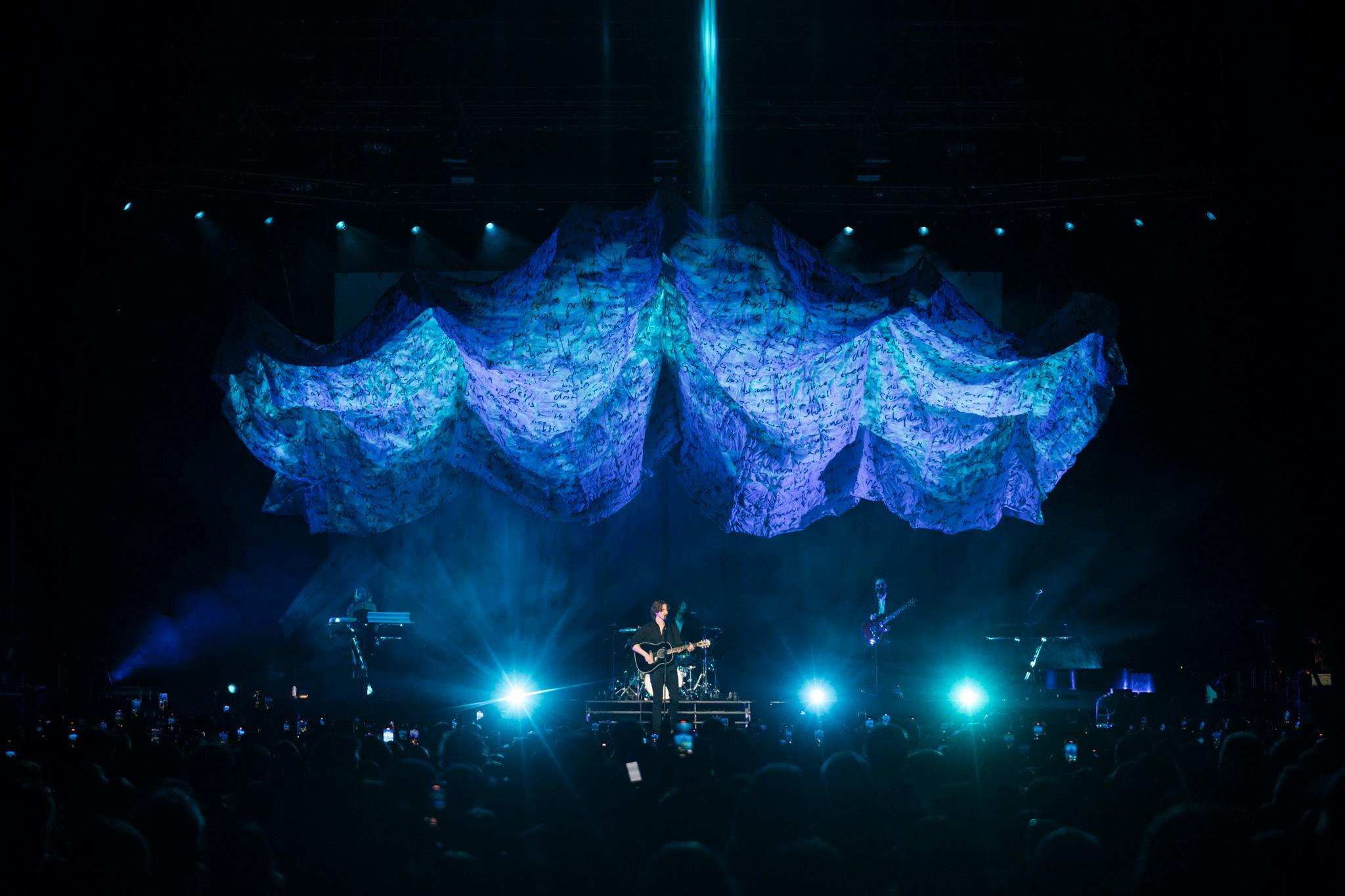 Dean Lewis wanted to highlight his journal entries that had become quite popular on social media. He was also drawn to the beauty of nature in his song writing. Sooner combined these two thoughts to create a large, floating paper mountain above the stage using a high resolution capture of the artist's handwriting. Sew What used a combined of metal screen and printed fabric to create the crumpled look with a grid of pick up points along the back. The floating scenic piece took light beautifully.