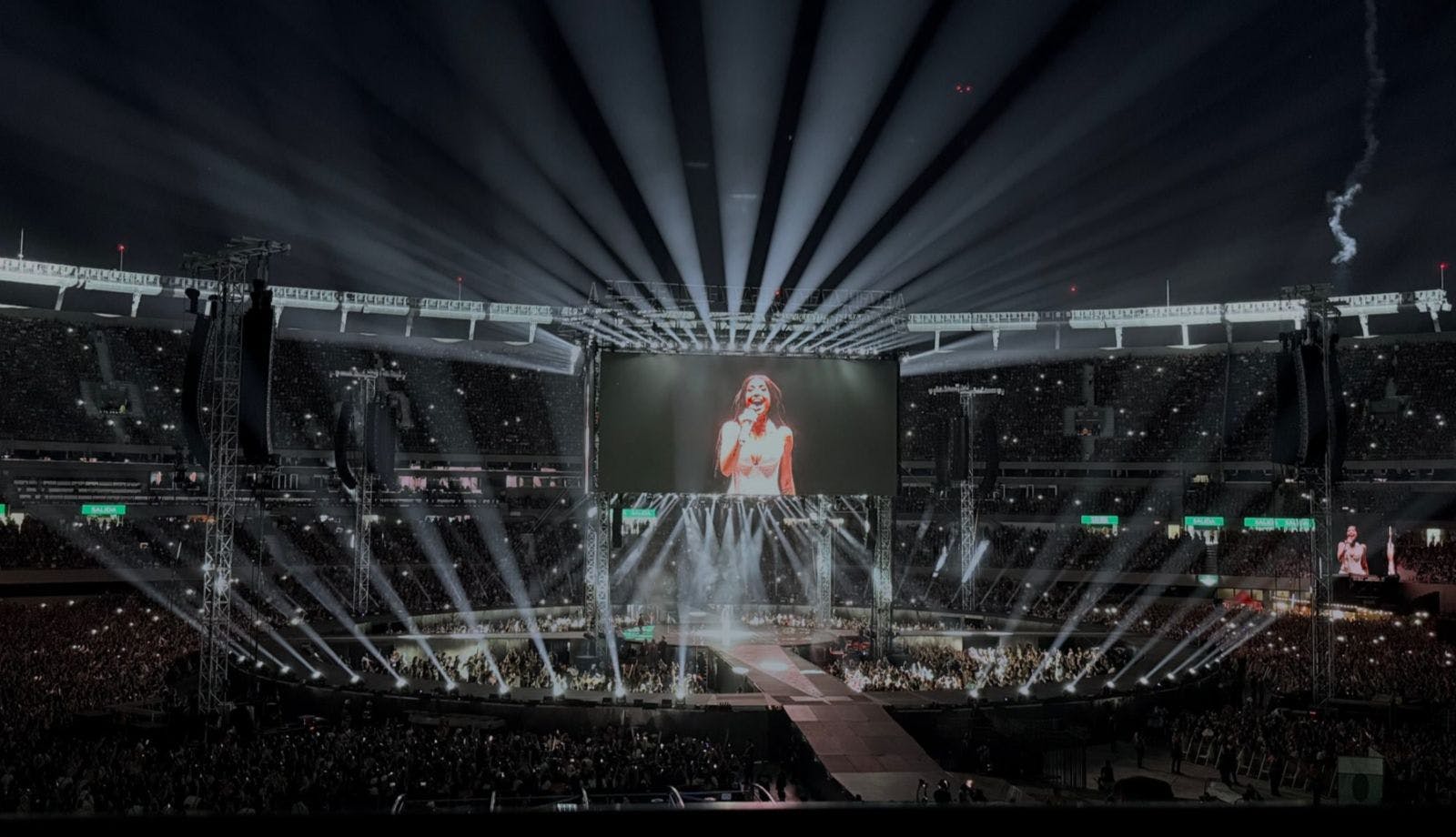 The band also performed several songs from their extensive catalogue including the most recent, Saviors. All Saviors songs were treated in black, pink, red, and white colors to set them apart from the rest of the show.
