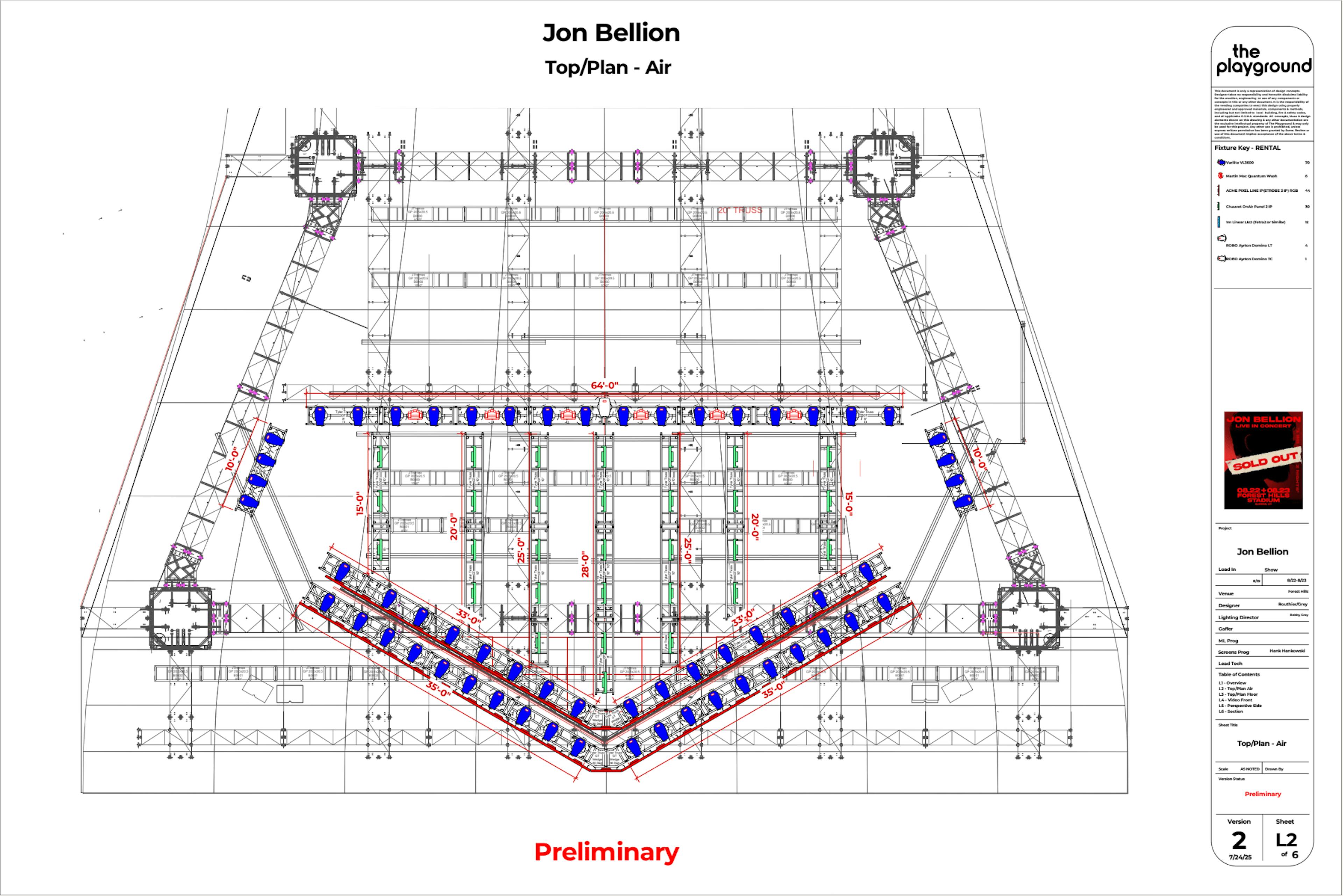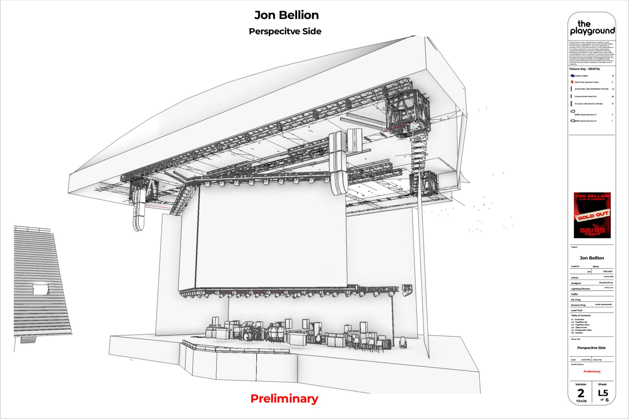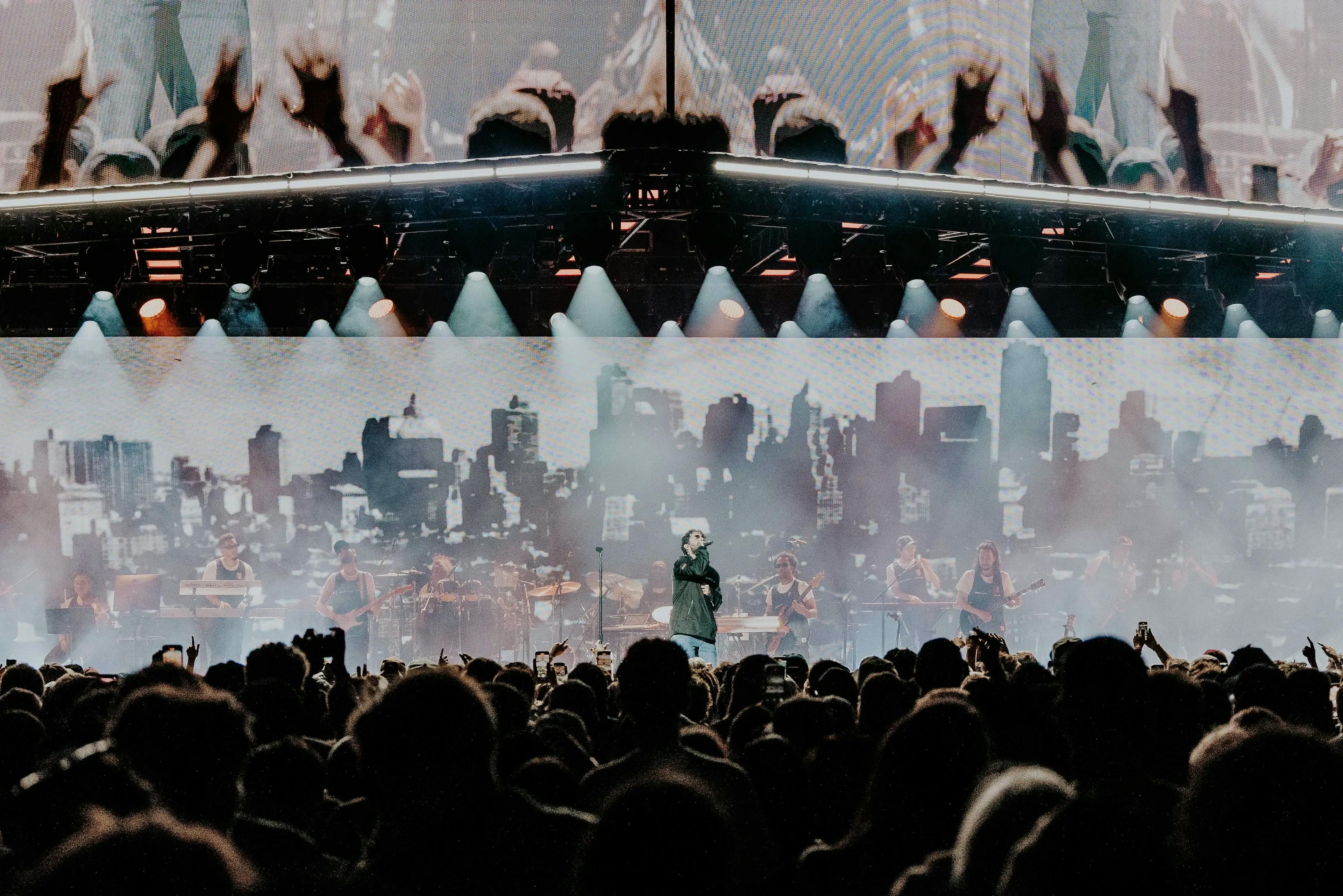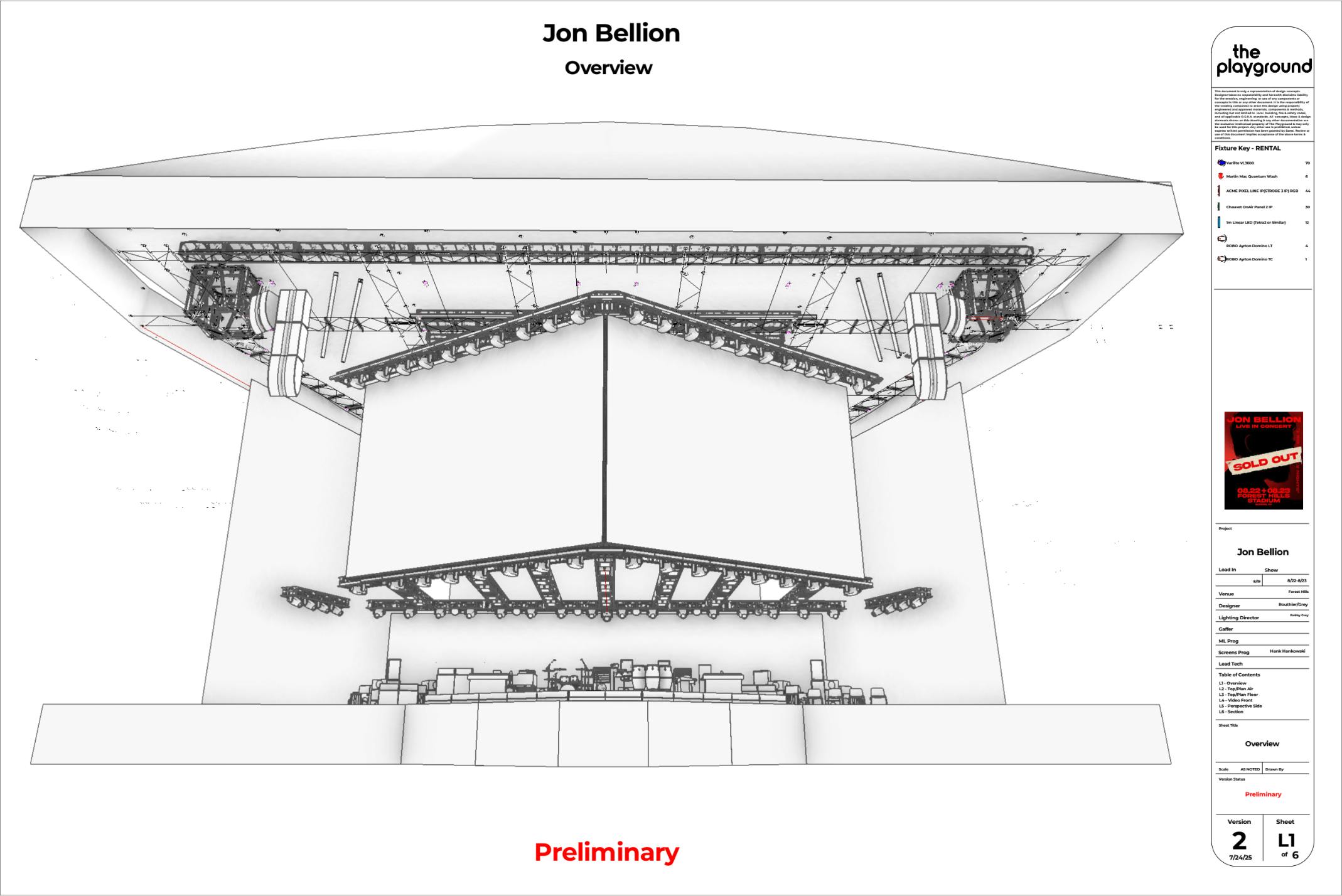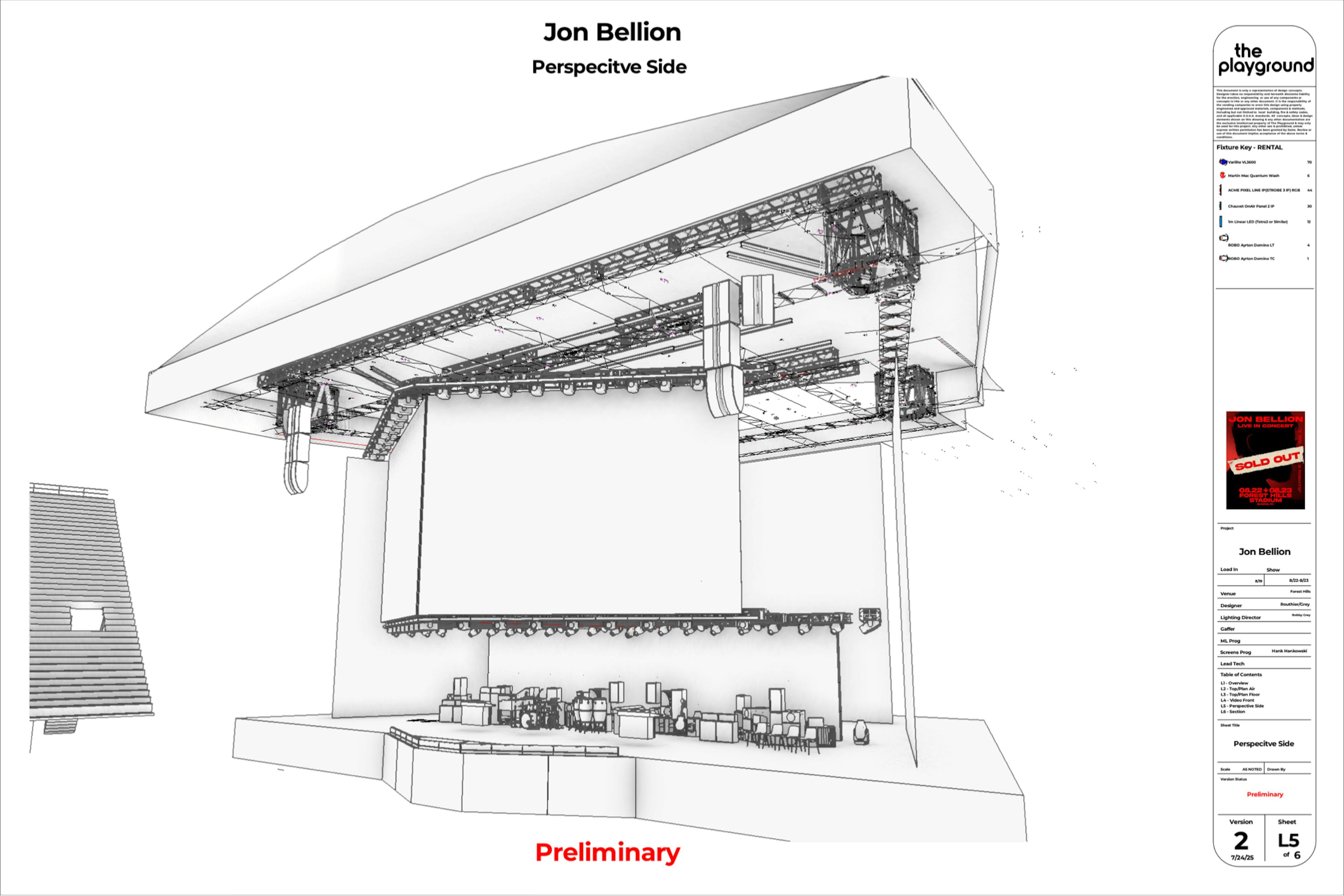The team wanted to create an intimate environment on the large stage at Forest Hills Stadium, transforming the space to place Jon and the band in a recording studio-like setting. The creative direction from the artist called for multiple distinct acts throughout the show, each with its own mood and visual identity. One of these acts was fueled by music improvised live by Jon, requiring the design to feel flexible, organic, and responsive in the moment. The goal was to make the audience feel as though they were witnessing something personal and spontaneous, despite the scale of the venue.