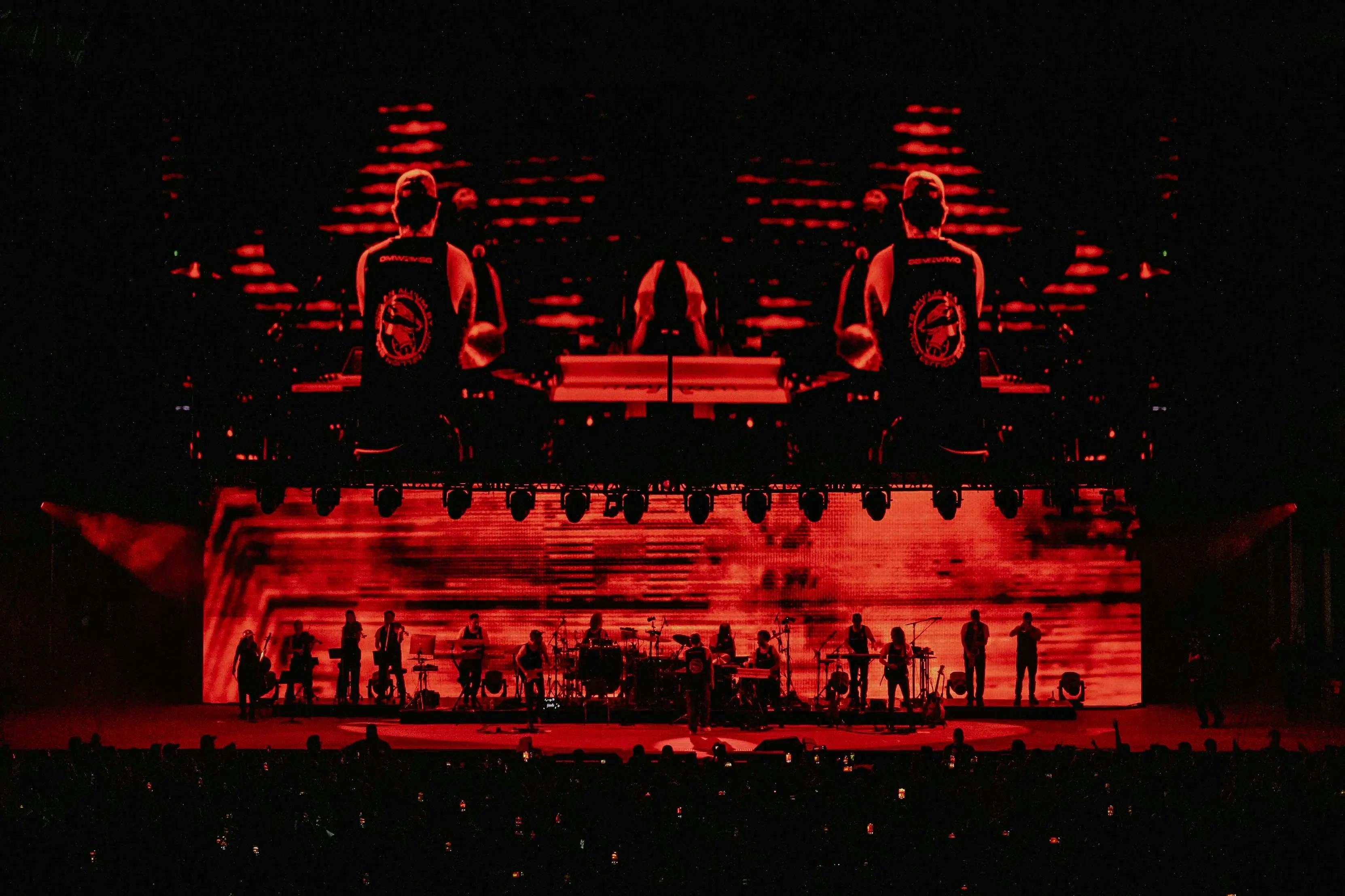 In order to create this intimate environment, the team installed an imposing video wall that helped visually compress the stage and create a low “ceiling” effect above the band. Panel lighting was incorporated to mimic the look and tone of fluorescent fixtures, further reinforcing the feeling of being inside a working recording room. Across the back of the stage, the designers added a low-profile video wall that allowed silhouettes of the band to emerge throughout the night, giving the performance depth and atmosphere. These layered elements worked together to make the stage feel contained, cinematic, and immersive, supporting both the structured and improvised moments of the show.