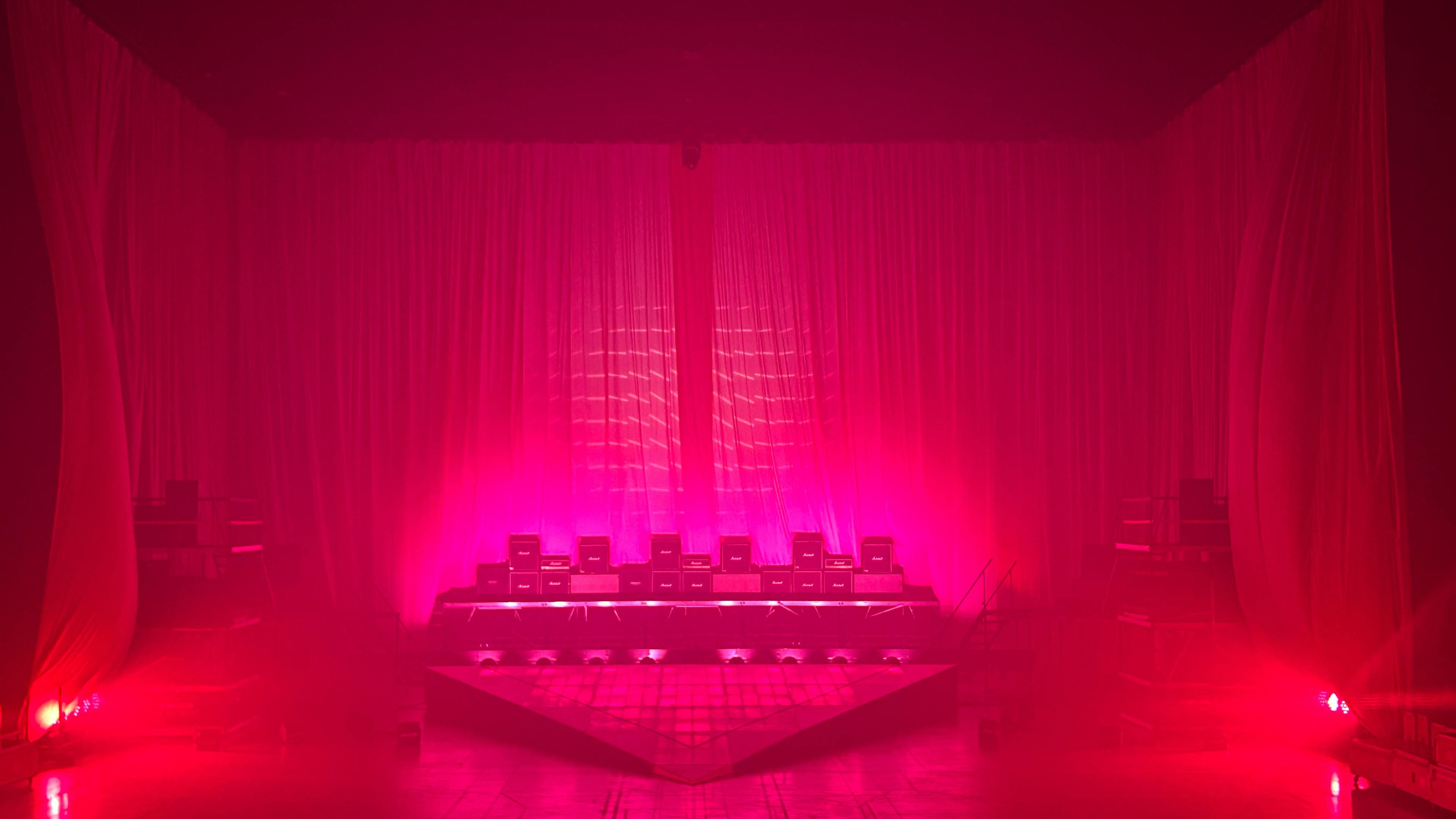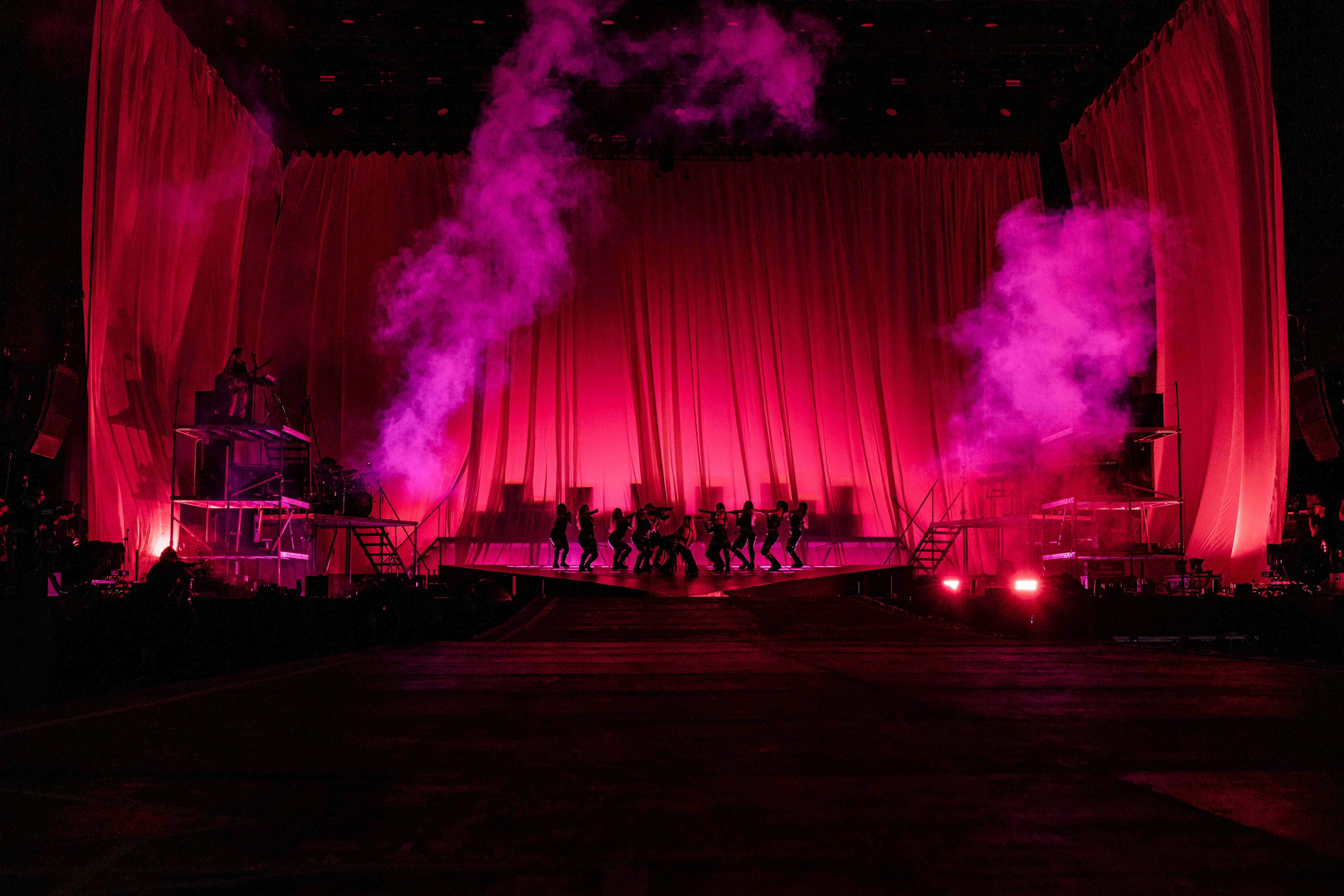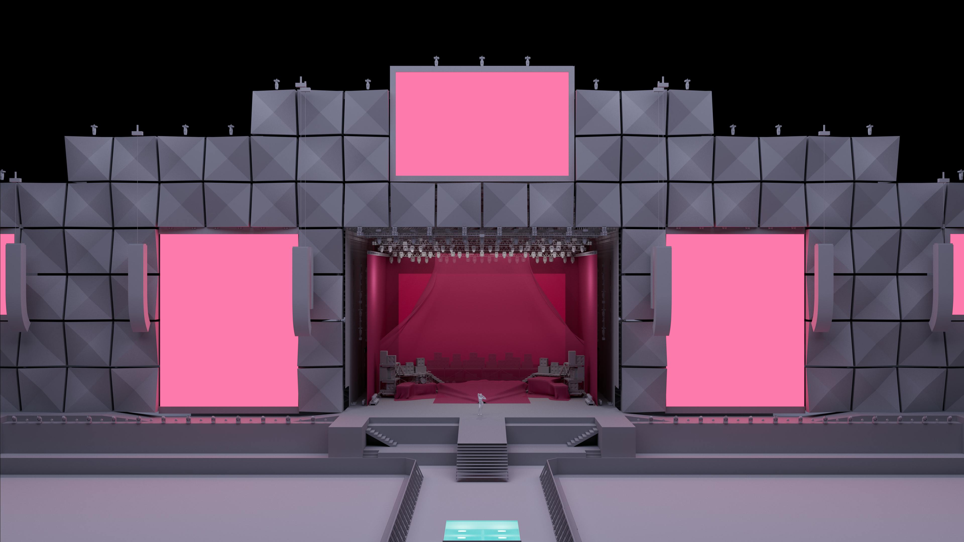 Trevor and Sooner created a world painted in soft, pink fabric across the large festival stage per Karol G's vision. Band risers constructed of scaffolding with guitar and bass amps peppered throughout sat in the stage left and stage right wings. They worked closely to create the artist's vision and constantly renewed the look throughout pre production and rehearsals.