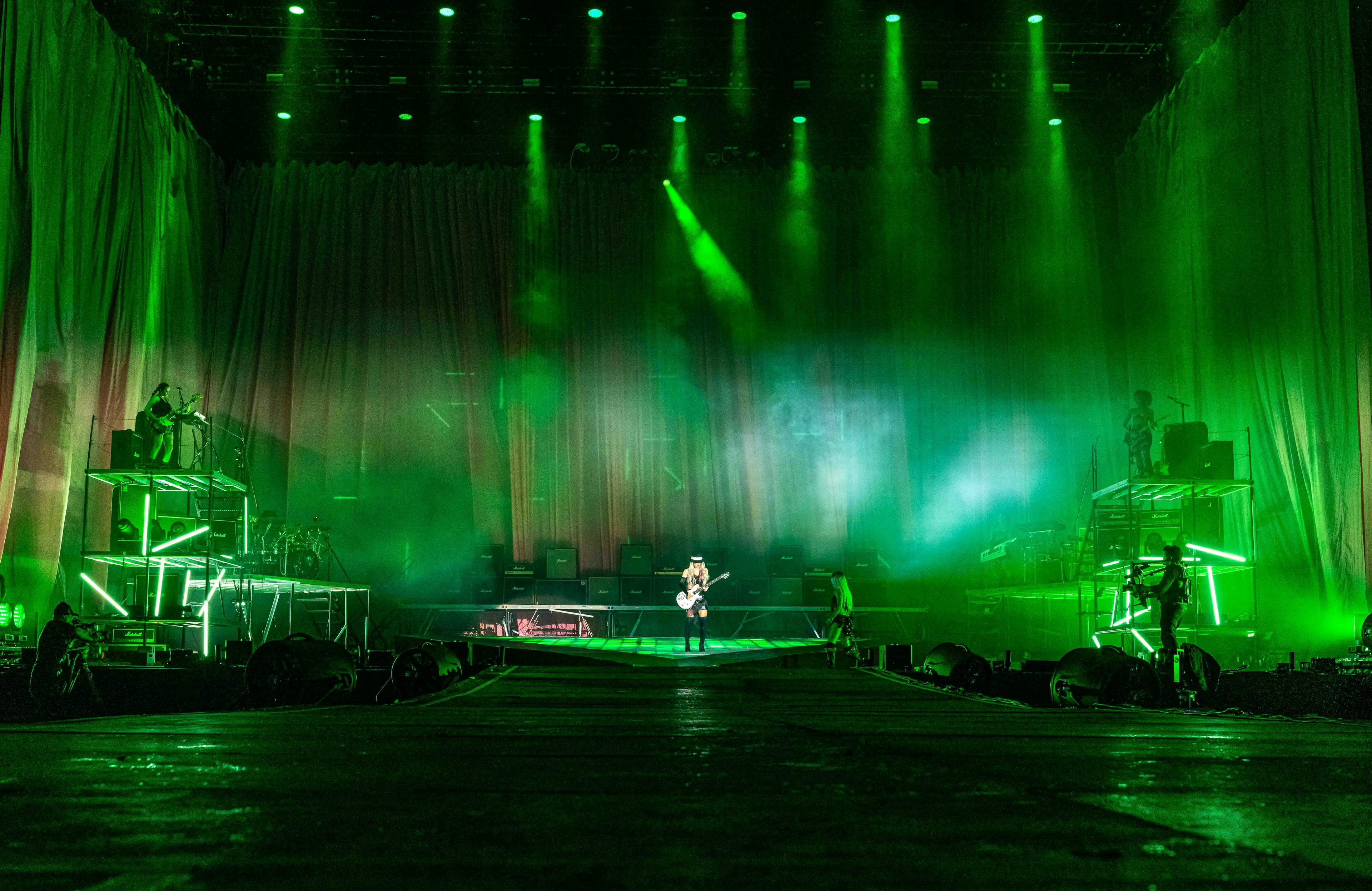 Karol G presented a stage design for 2024 Rock n Rio that married bold, feminine, reggaeton flair and rock n roll aesthetic. The stage featured pink satin curtains framing the setup, adding a soft, glamorous touch that contrasted beautifully with the industrial edge of exposed scaffolding and stacked guitar cabinets. This juxtaposition created a visual statement—blending the world of Latin pop with the raw spirit of rock and roll.