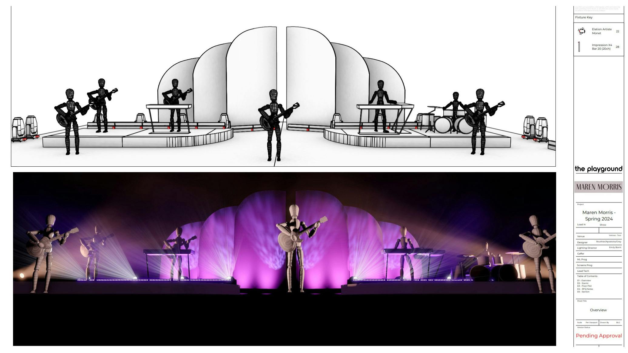 The team created a simple, white scenic element that would serve as a backdrop for Maren's performance. This piece was executed by Upstaging to compact and pack up in a manner that was truck pack friendly. Bobby Grey of Notan Creative executed a lighting design that allowed the lighting director to maintain the production manager's vision no matter the size of the venue.