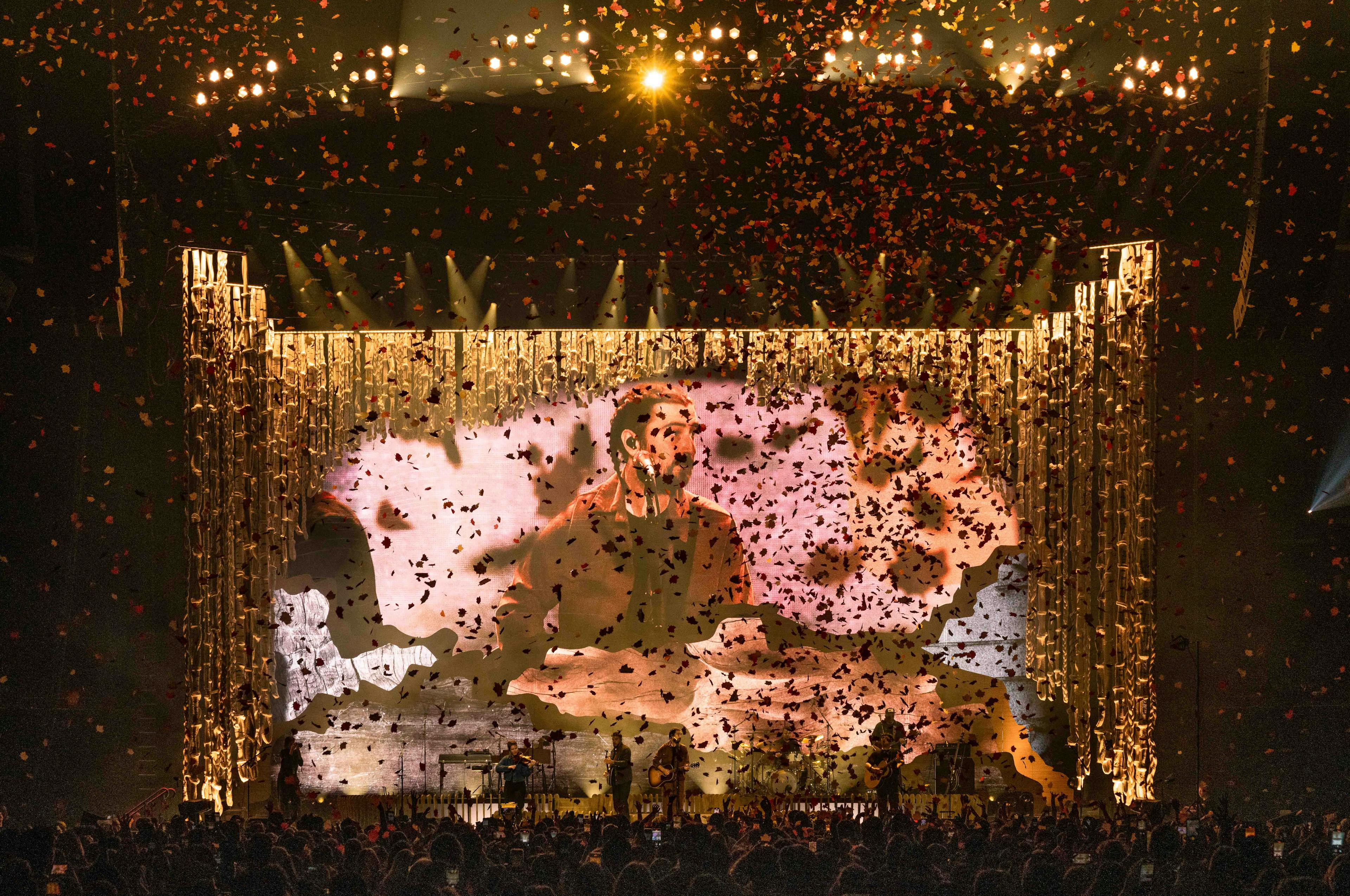 Corinne and Sooner built in special moments throughout the set based around Noah's childhood and the seasons of Vermont. A living room set up created a stripped down environment for an acoustic scene. During the song Northern Attitude, snow fell. For the final song of the set, autumn leaves of gold, red, and yellow rained from above.