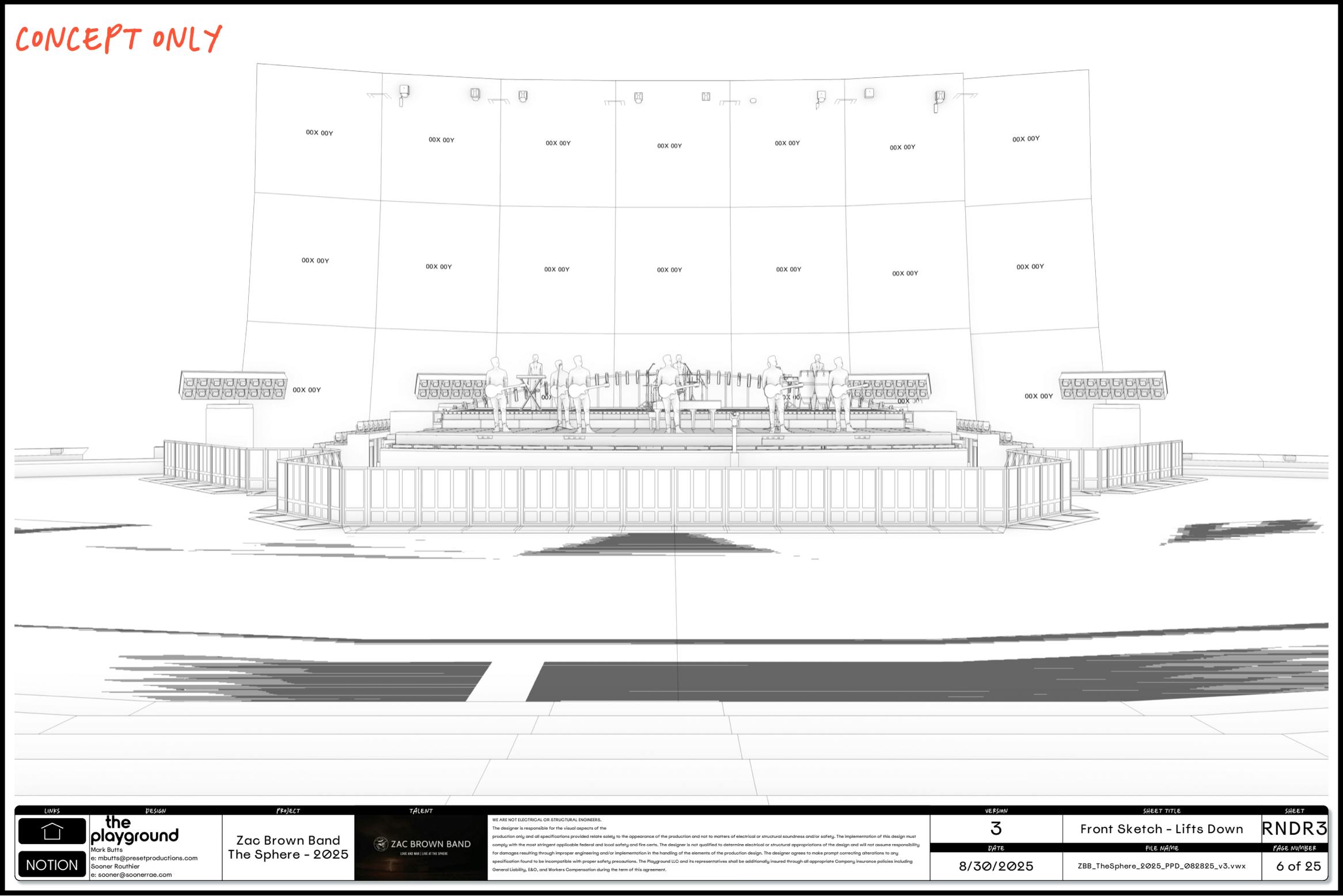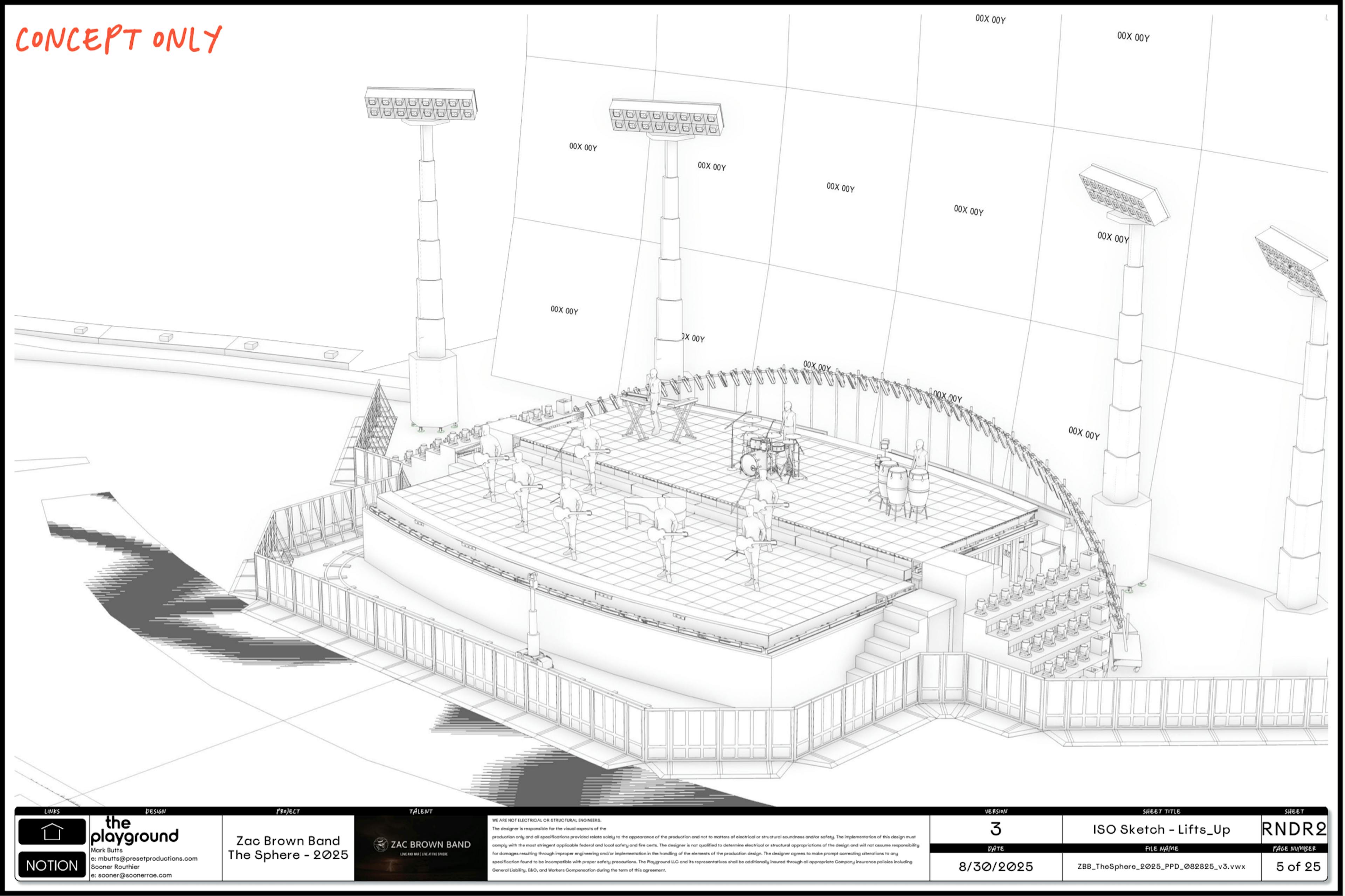 Mark and Sooner worked closely with Tyler Lord and Zac Brown to take the audience on a personal journey in The Las Vegas Sphere residency. Together, they designed and built a stage that fit into the architecture of the upstage curved wall of the room. Lighting was placed on a graceful arc behind the stage to create backdrop and enhance the musicality of the songs. They also placed large banks of lights on moving towers to provide height in the lighting rig.